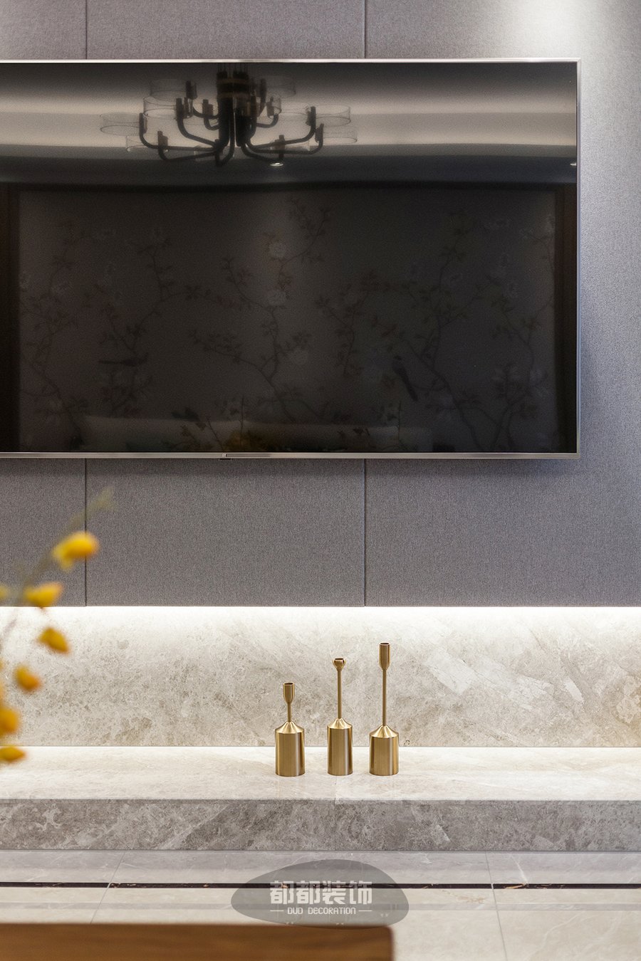 电视背景墙由5片灰色木板拼接而成,在光影的衬托下,纯色也变得有质感起来。