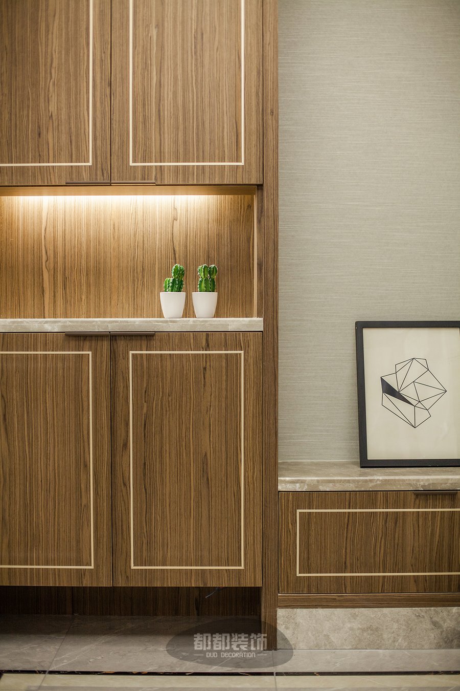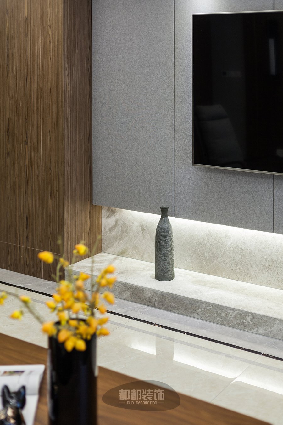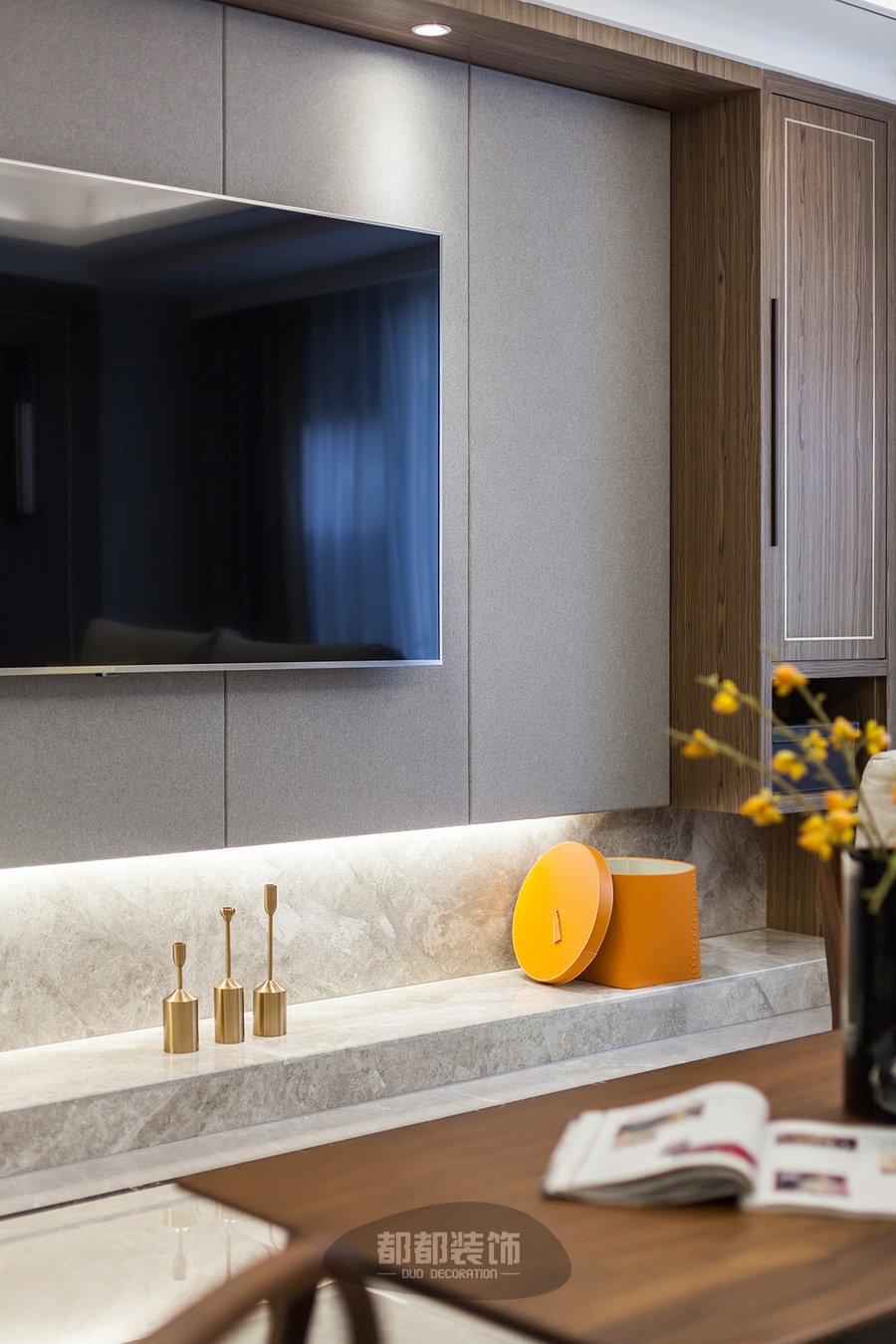 连贯的木色,点缀的大理石,柔硬有度,是生活的感悟,背景墙的线条和排放,像有节奏的音符。