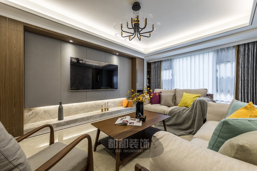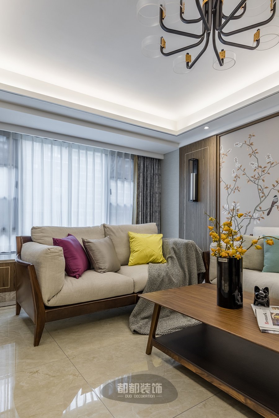 木质布艺沙发,点缀简约金属质感的灯饰,空间风韵简中有雅。