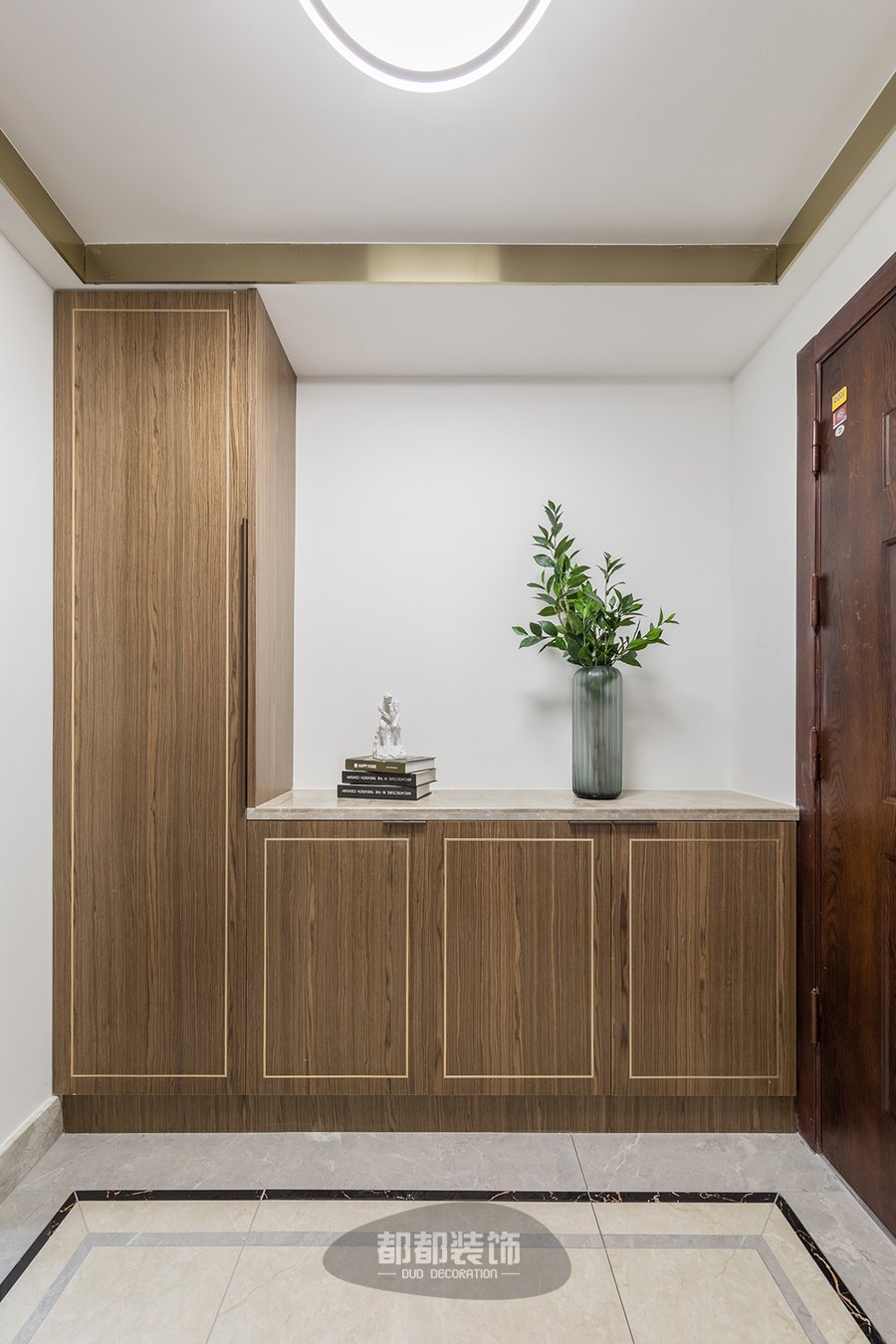 玄关的空间不大,橡木的配色却能给人一种自然古朴的放松感,让小家也能有大范儿,玄关的光线设计感细节突出,竖立的原木拉长了空间的高度,和谐地起到了间隔效果。