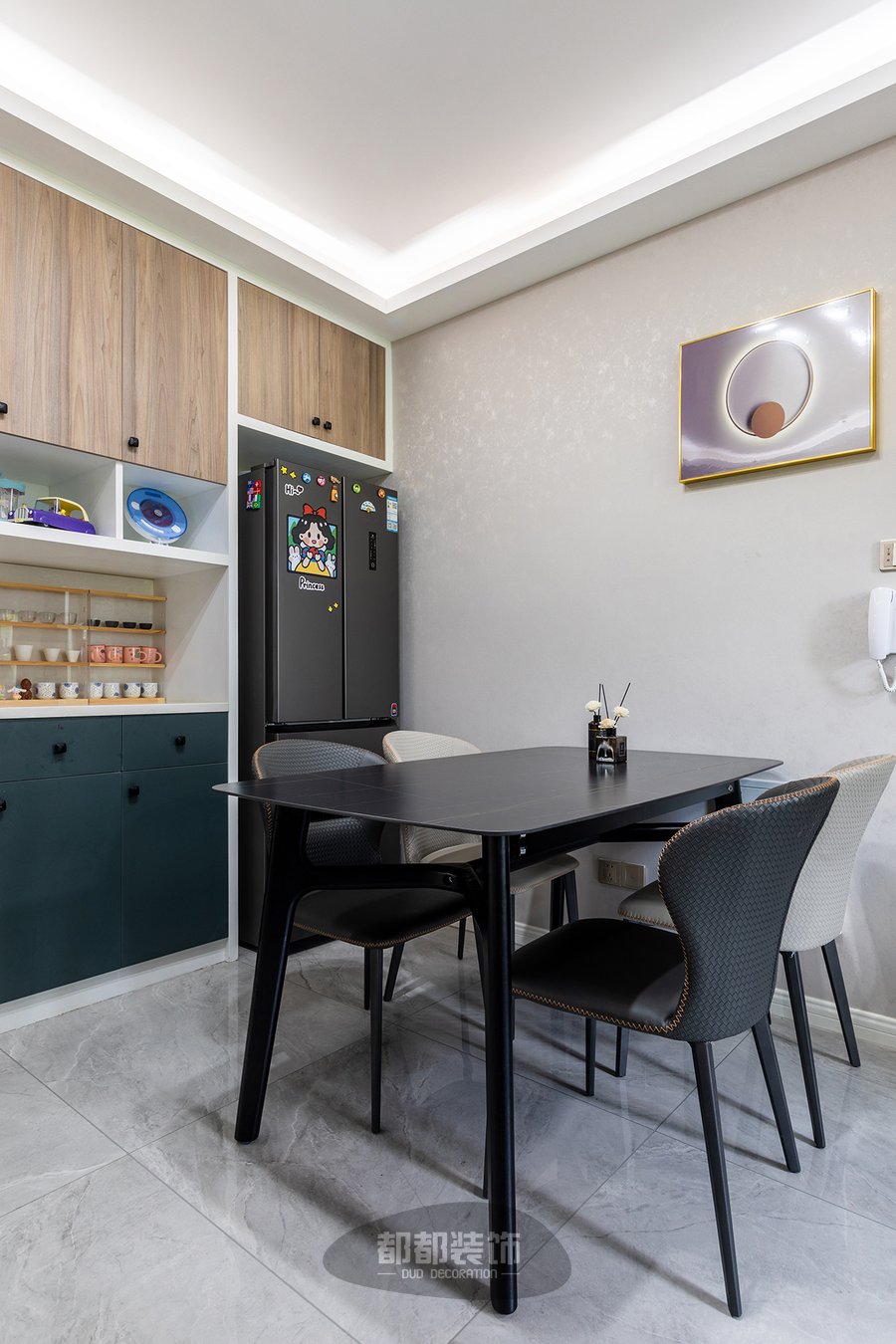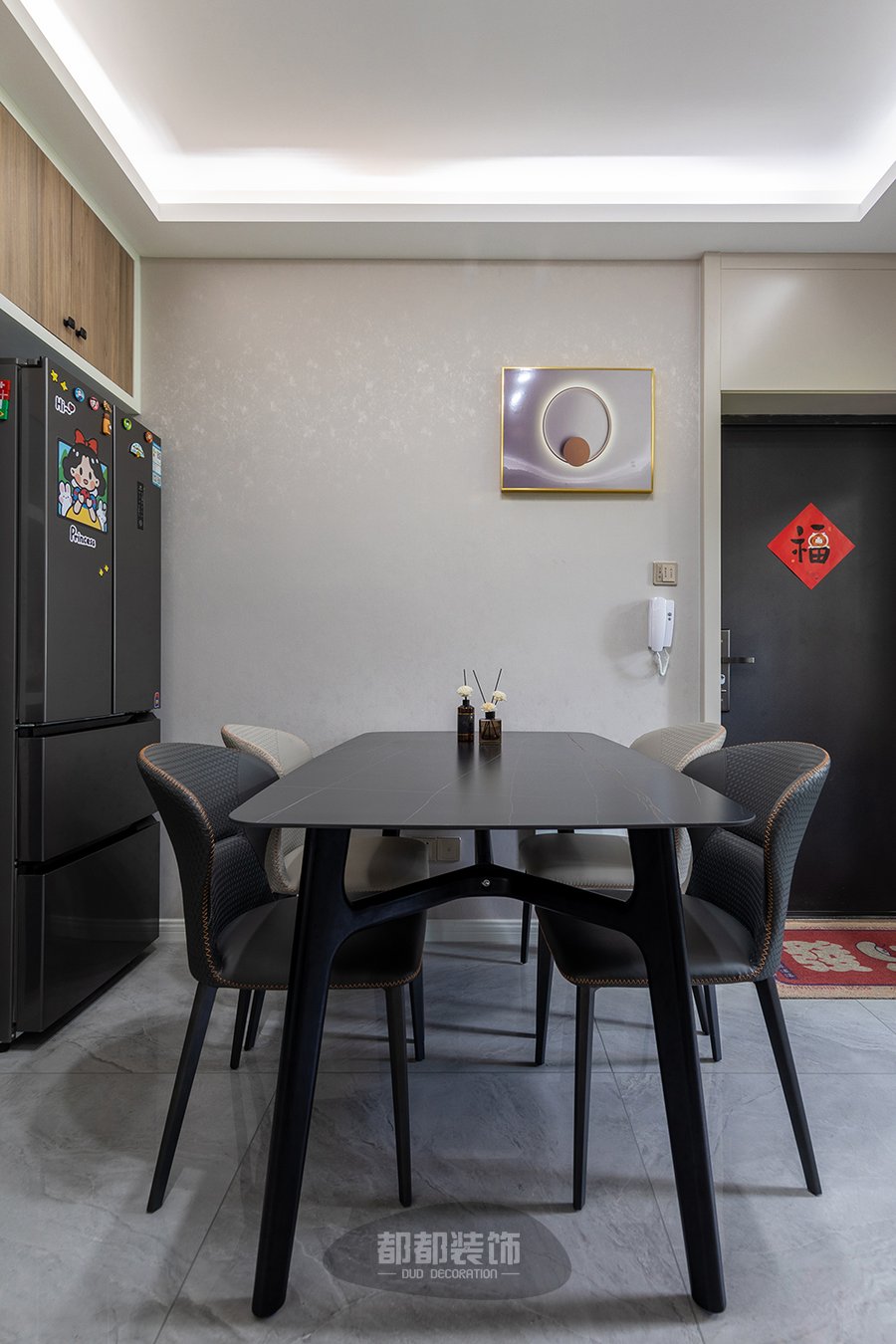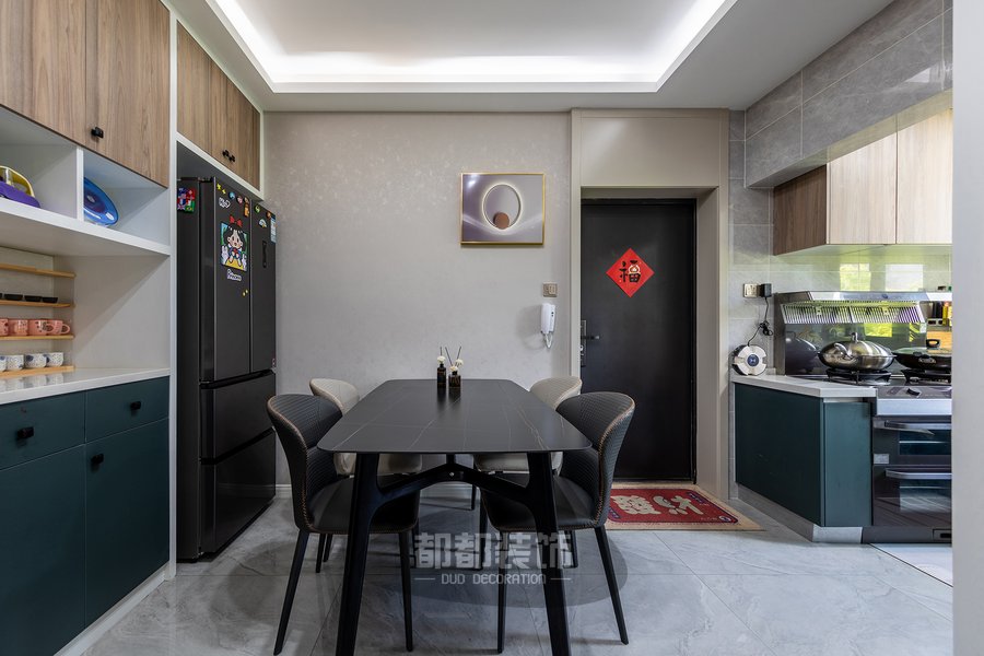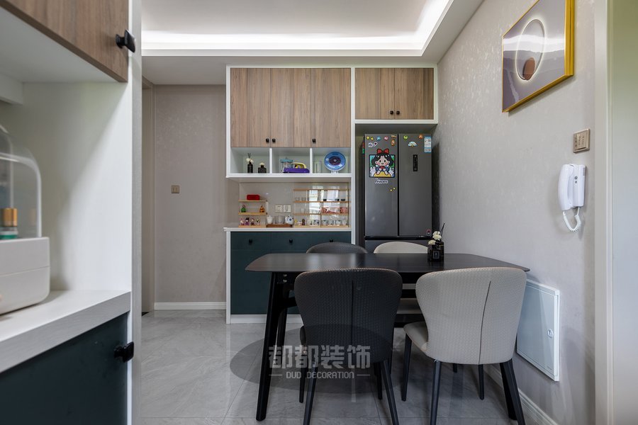 餐厅和客厅是分开的两个空间,却巧妙的将开放式厨房与餐厅融合在一起,还是那么舒适,黑色原木餐桌椅和冰箱来了个同色系碰撞。