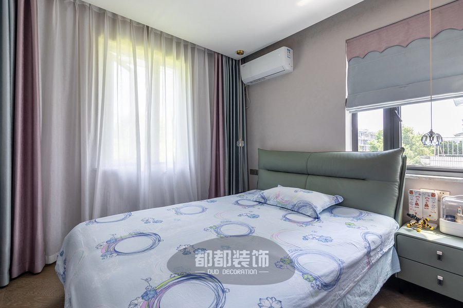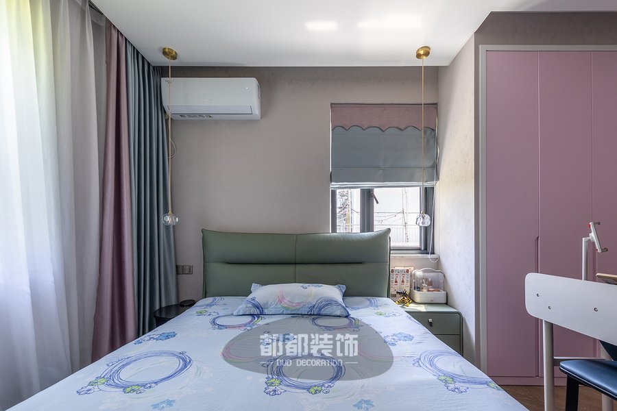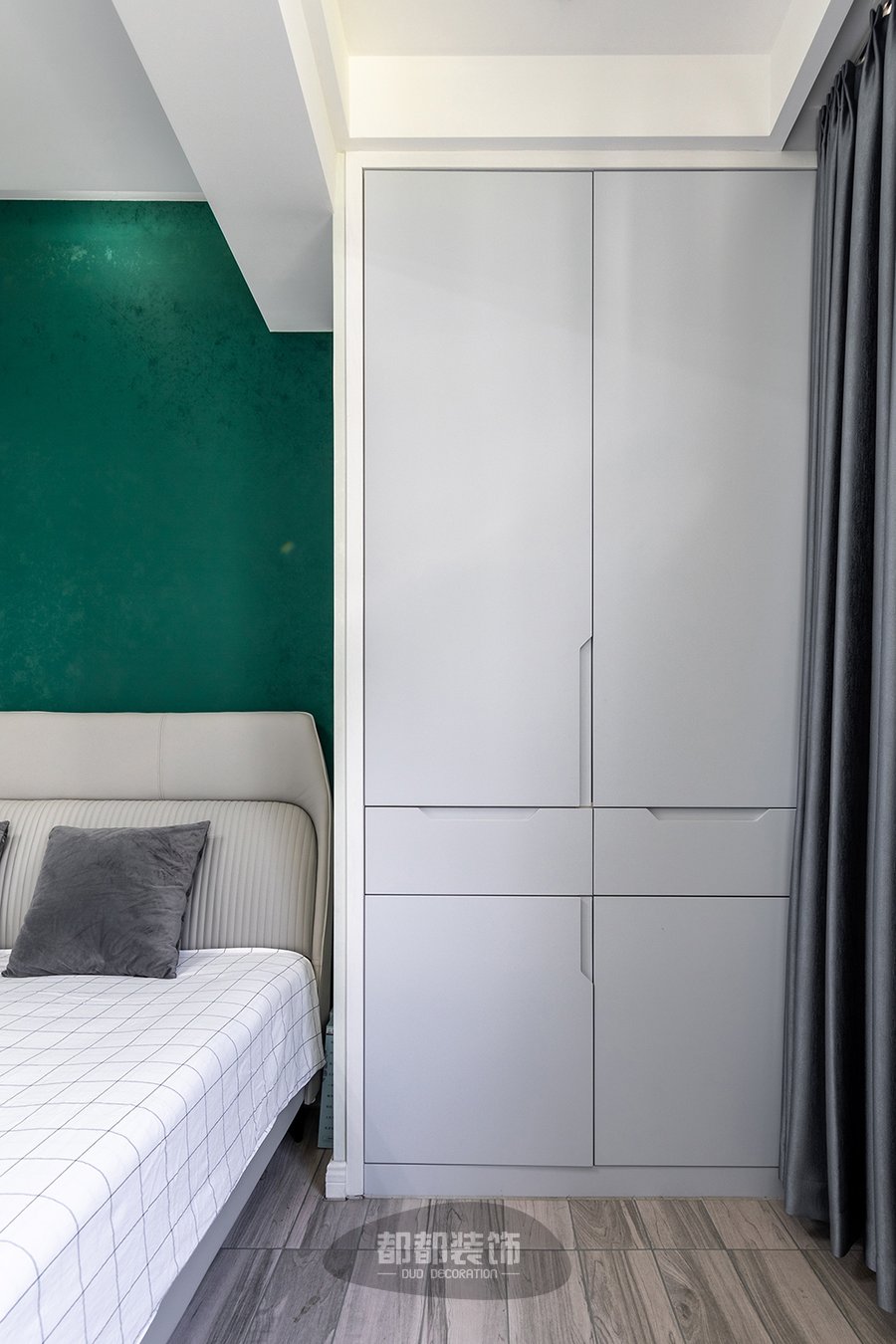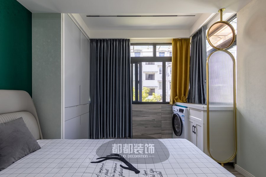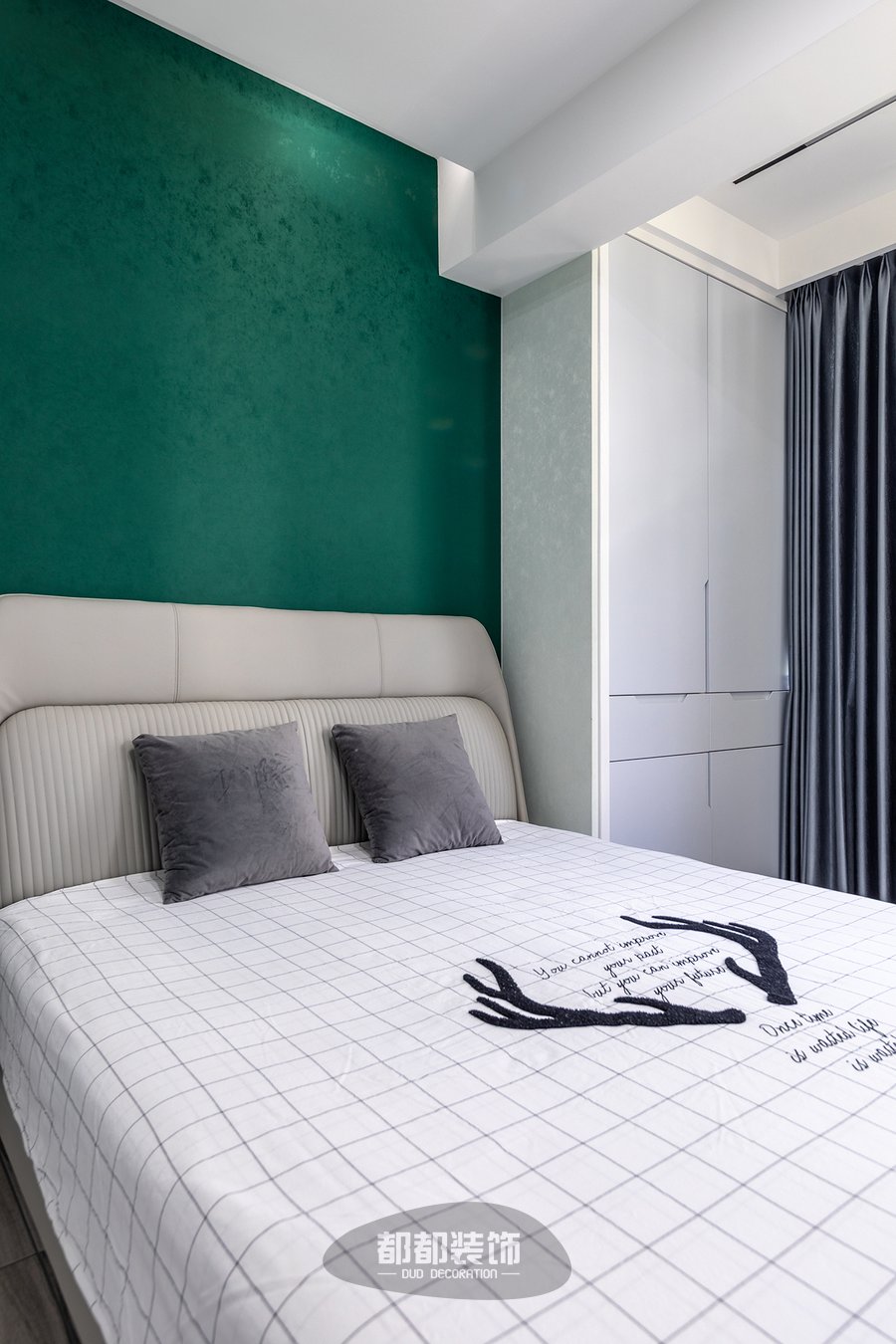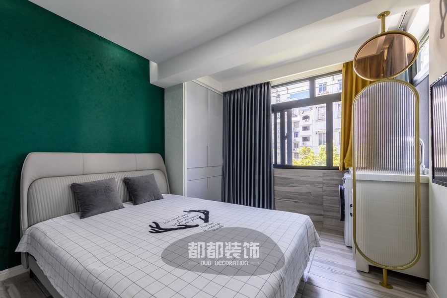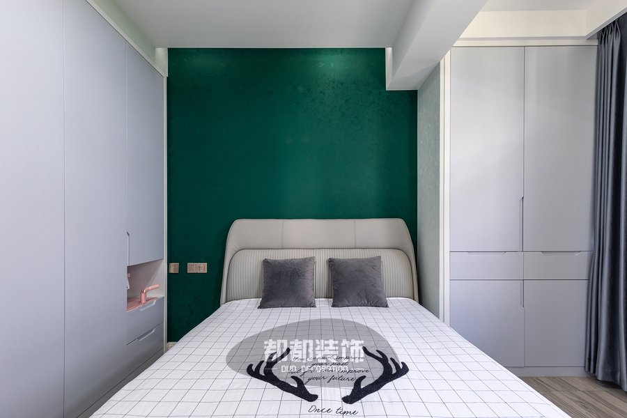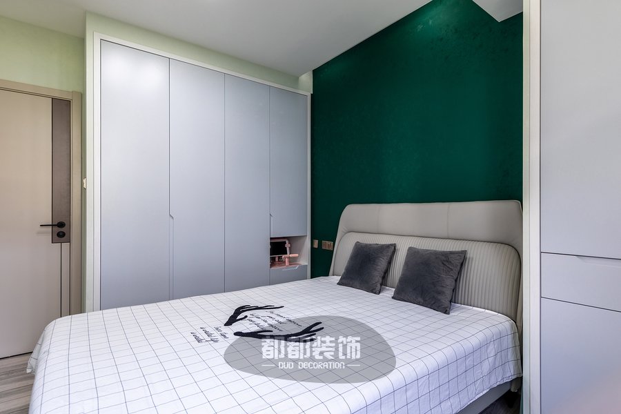 主卧是抓人眼球的绿色系,碧绿色背景墙有很强的视觉冲击感,为了中和这浓烈的色彩,床品用到了清新的黑白格设计。