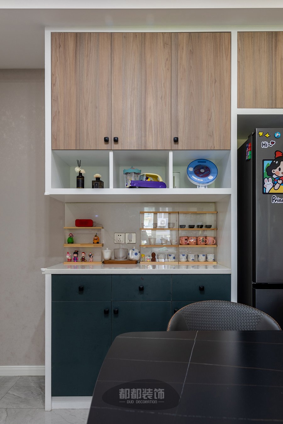 餐边柜上放满了各种可爱小杯子,看得出来餐厅也是屋主常待的一块角落,经常给自己泡个茶或者咖啡静静的待着,或者放台笔记本,伴着键盘声、鼠标声认真的办公。