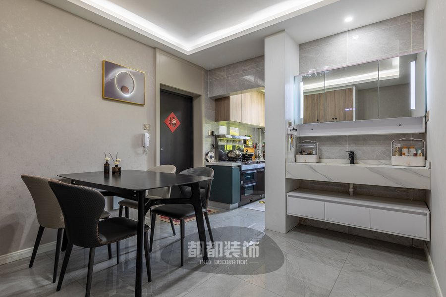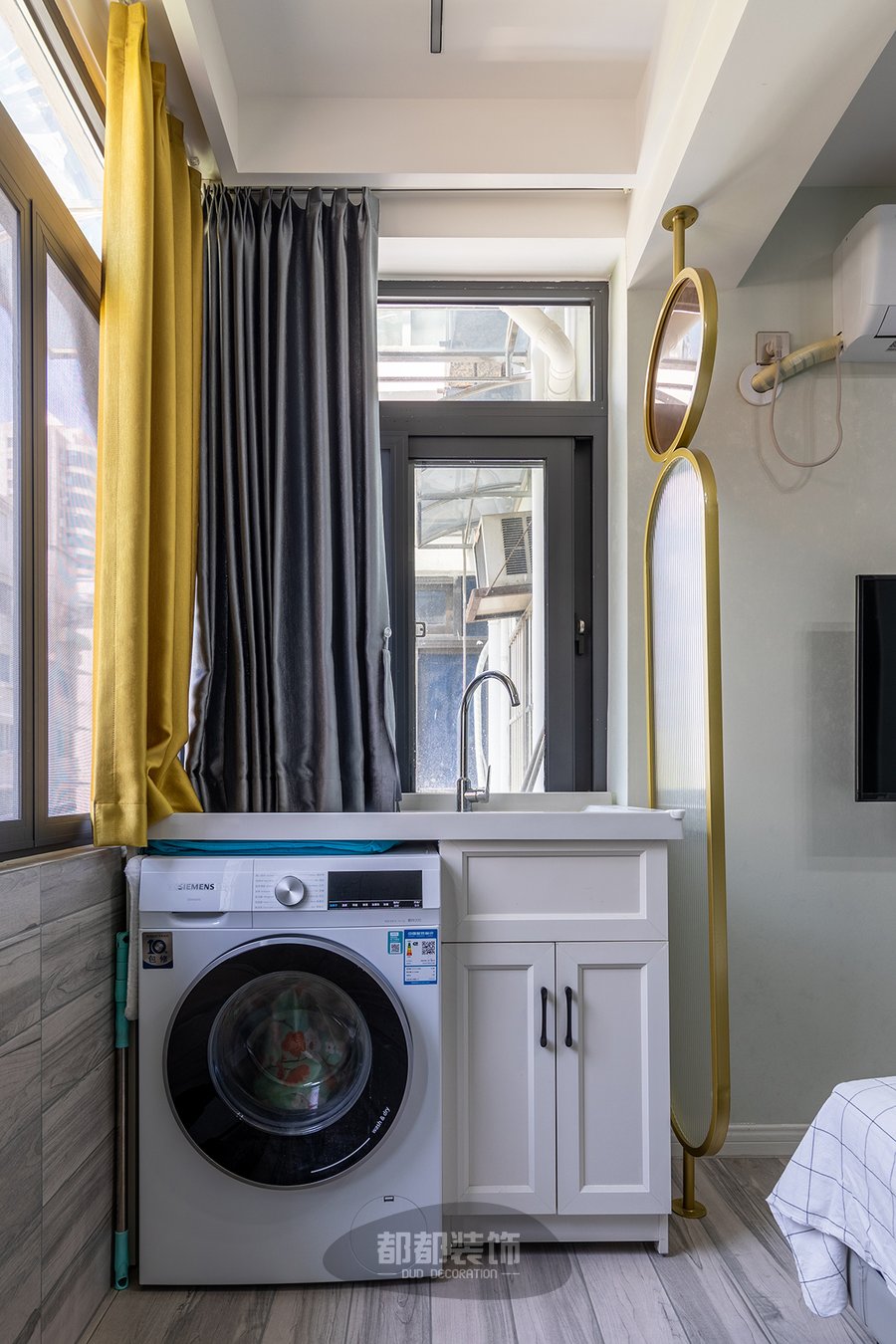 靠墙处设置了洗衣区,用拱形玻璃隔断颜值一下子提升了不少。