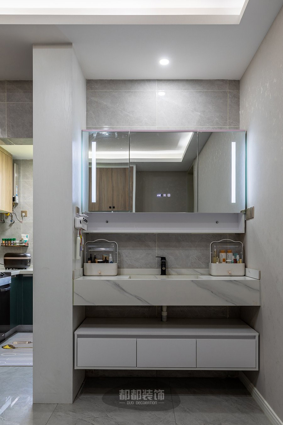 原本的公卫很小很拥挤,在以前由于没有收纳位置,都是把瓶瓶罐罐直接放在窗台上,不是很雅观,所以我们为了扩大这个空间,将与主卫相邻的墙面移去了一些位置,运用镜面柜与悬空柜解决了收纳问题还让空间更有视觉感。