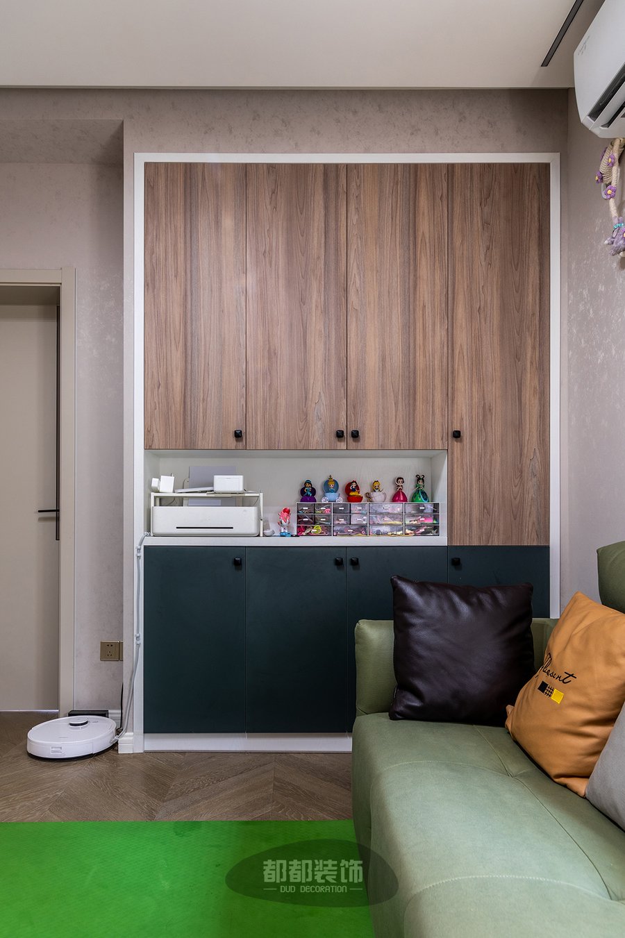一进门则是一整面的玄关柜,线条明了的一门到顶储物柜,增加很多的储物功能,深绿色+木饰面,视觉又简洁干净且提升家的高级感。