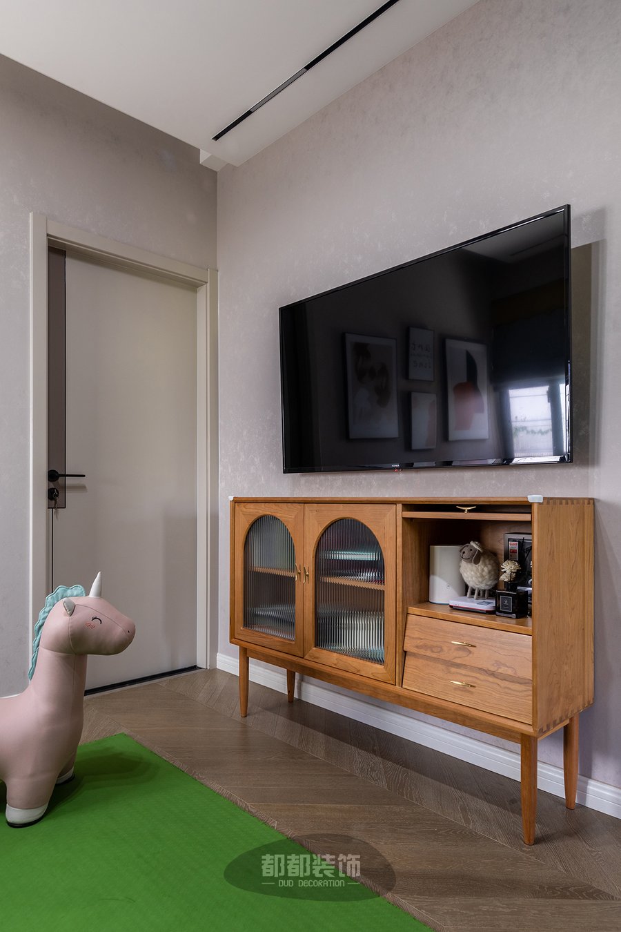 客厅舍弃了繁杂的电视墙,以印花壁纸代替,底下简单搭配一个北欧储物柜,开放格翻转门的设计增添了不一样的乐趣,实木的滑轨,一推一拉轻松收起柜门,长虹玻璃有散光效果,通透不显凌乱,藏在背后的小物件一目了然,朦胧又美好。