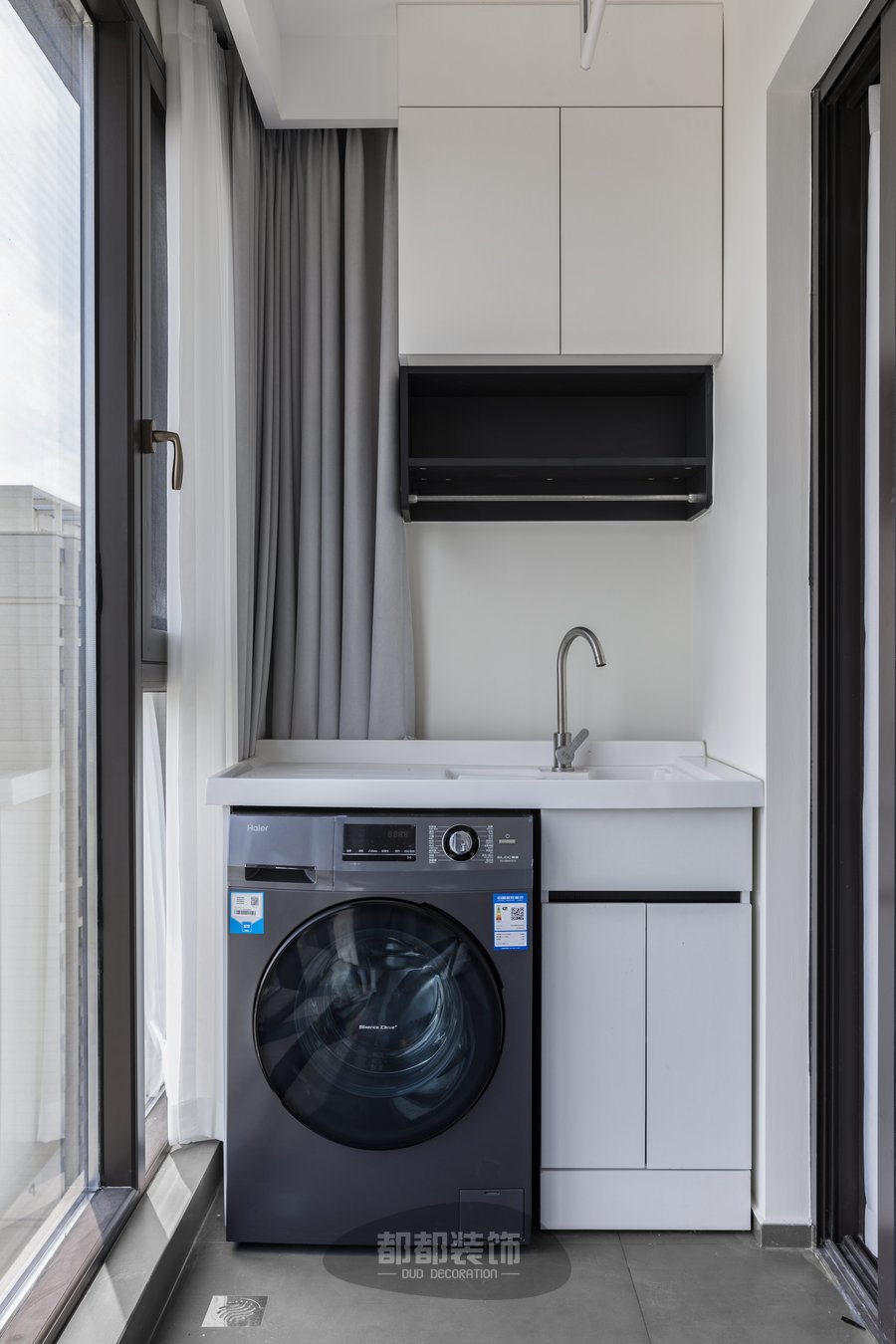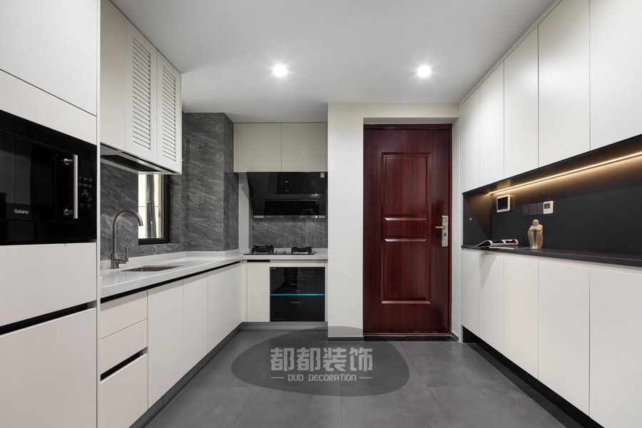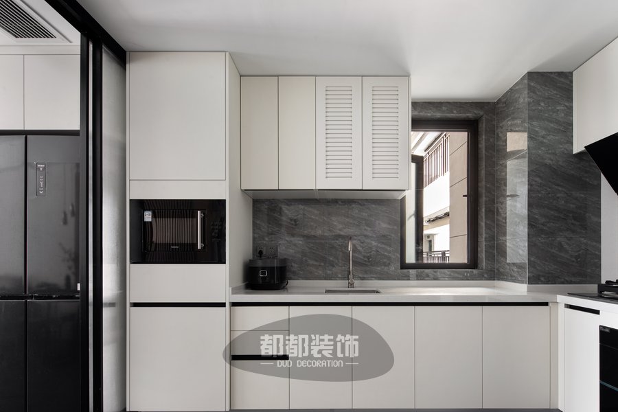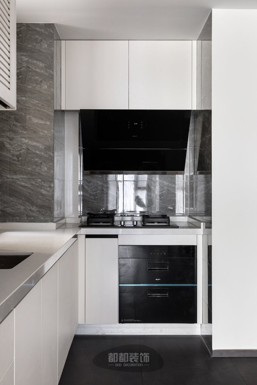 厨房的橱柜设计成外白内黑的形式,墙面采用灰色瓷砖,避免了颜色之间的单一感,又通过不同材质,简约而不失时尚的色彩加材质来展现一个空间的灵动性,显得整个空间很有韵味。