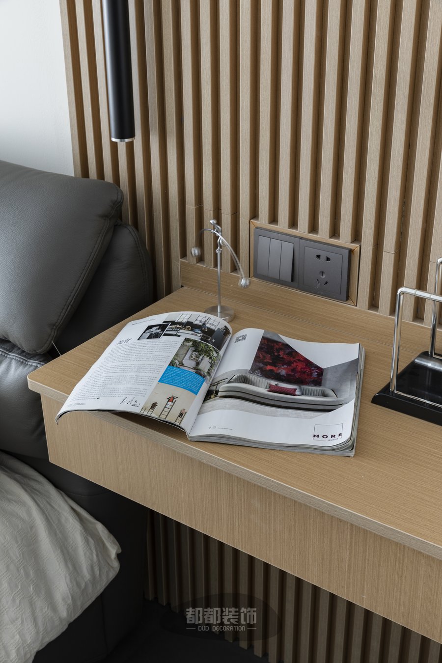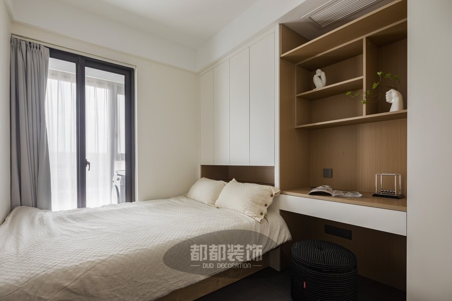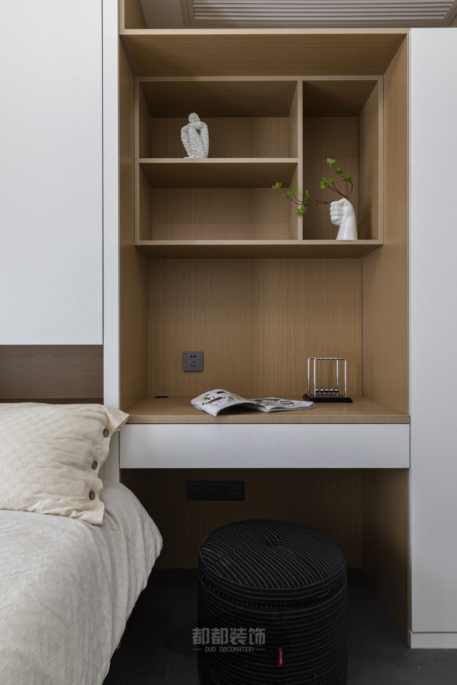 次卧以木色和白色为主,营造出温馨、舒适的整体风味,次卧很小如果再定制衣柜就会给人压抑的感觉,设计师奇思妙想将床头连接书桌,打造整墙的收纳空间,底下中空的位置方便放遥控器、手机、充电器等小物件。