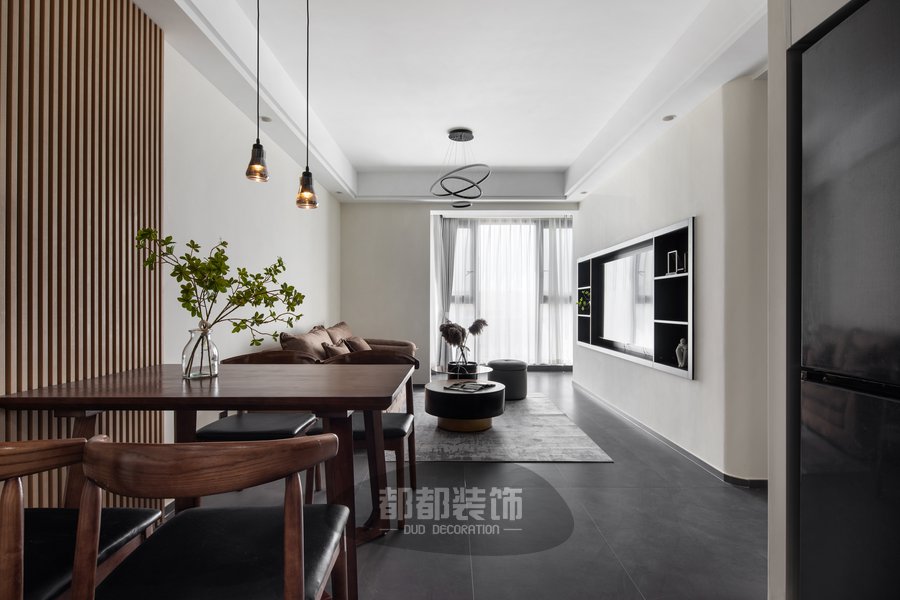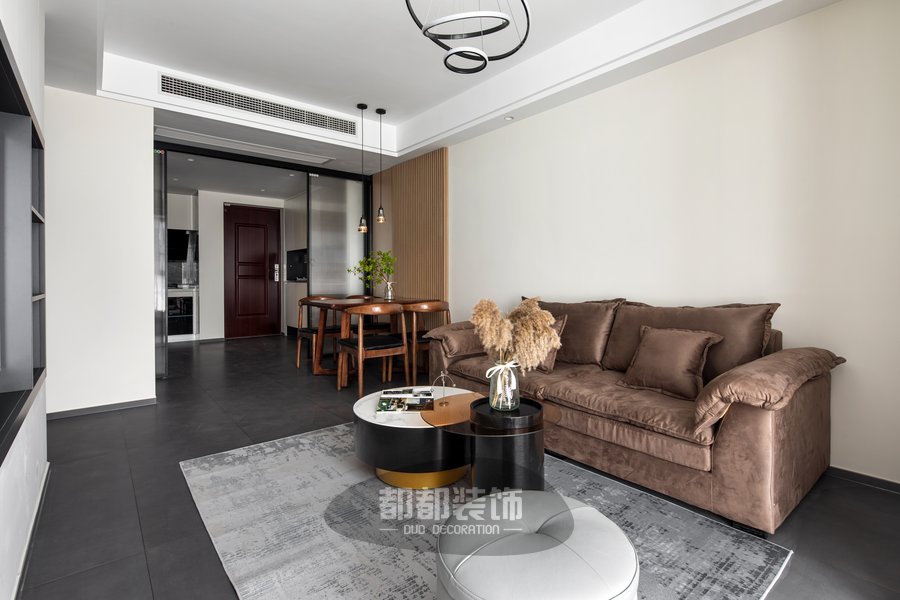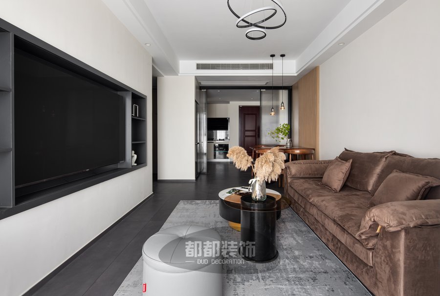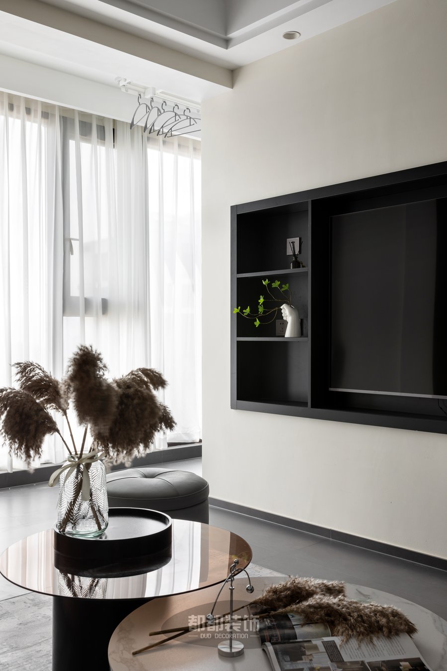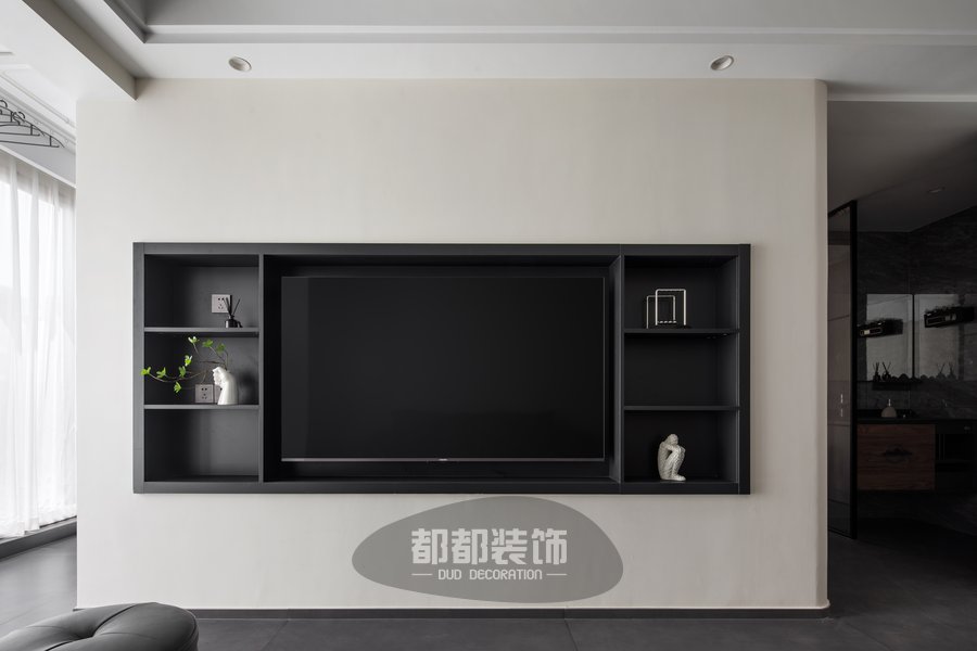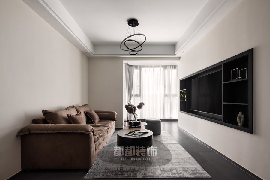 经典的黑白主色电视墙与大地色系的沙发环抱相拥,回字形设计凸显出极简的艺术。