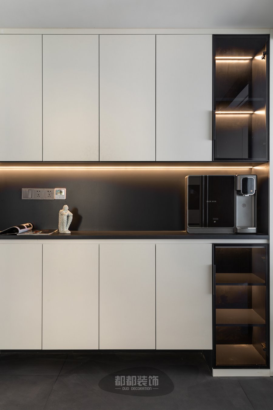 橱柜无把手设计简洁大方,设计师将餐边柜搬进厨房,地柜+吊柜强强联手,收纳满分,也可以当玄关柜使用。