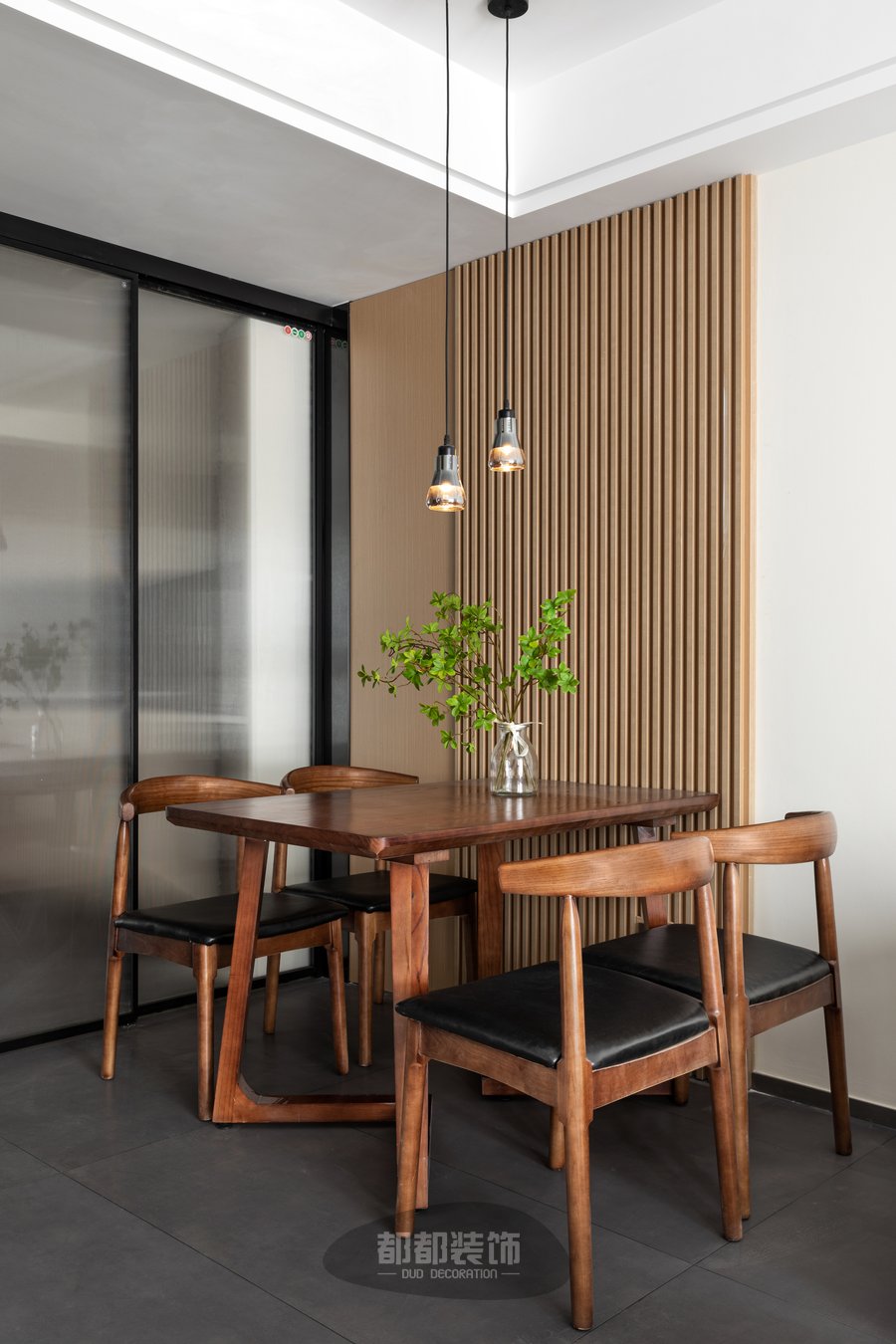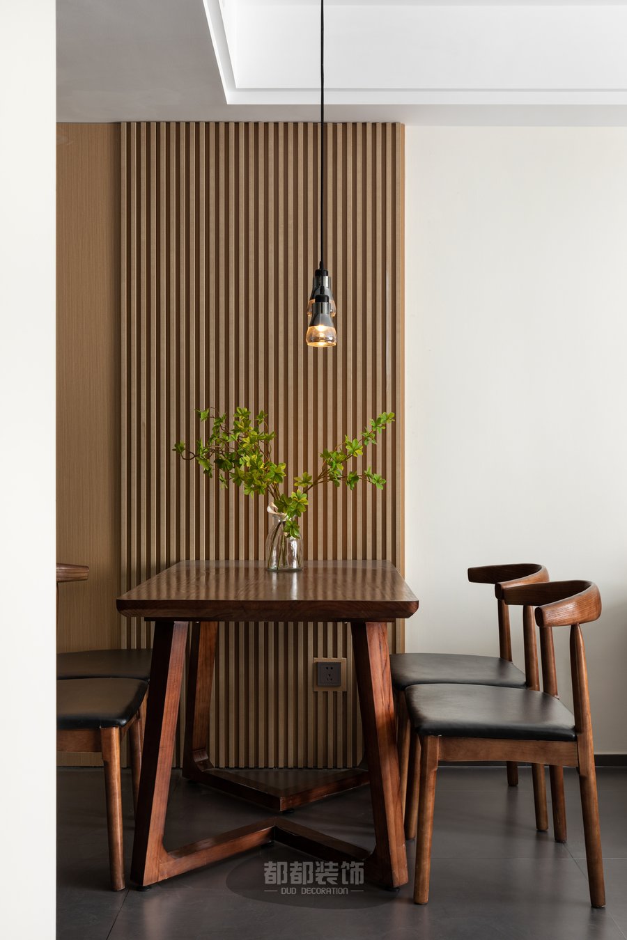餐厅空间也同样简单、安静,暖黄色木格栅背景墙,天然的木制餐桌椅搭配翠绿的盆栽,清爽的配色,有序的布局,将生活感与品质感密切结合,给人手可及的安心,将生活与乐趣融进房子里。