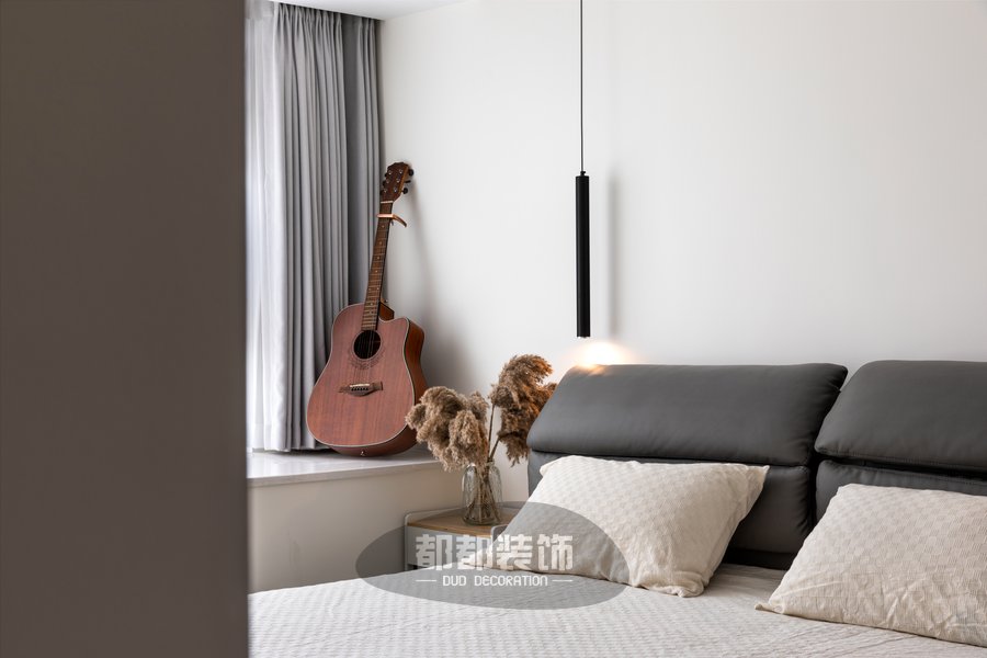 棉麻的床品配上平滑的皮质床头板,黑白色系流露出一丝时尚与浪漫,在舒适与艺术间产生共振,白色窗帘清清爽爽,营造出易于安眠的空间氛围。