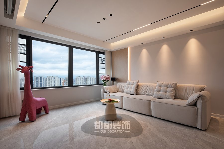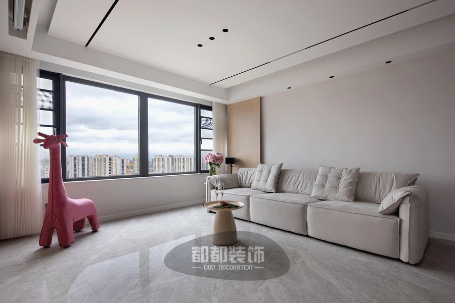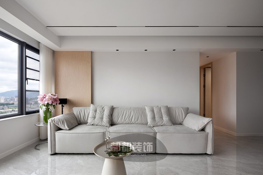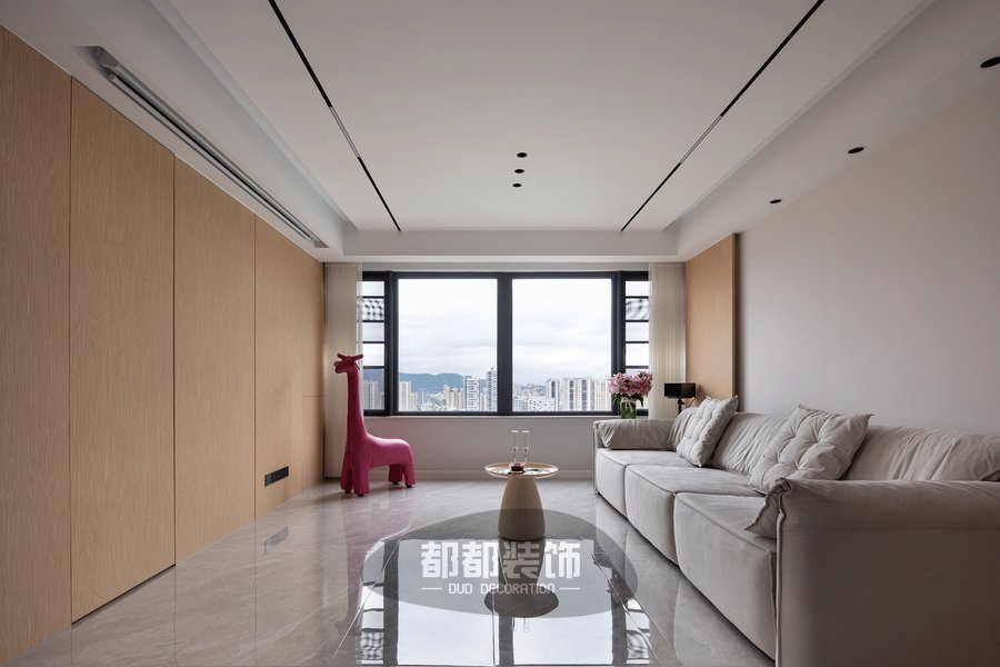 客厅采用大面积原木打造,给人自然大气的第一印象,完美诠释现代时尚生活方式,通透的大窗让室内与城市精致融合,通透而灵活,仿佛是一座悬与空中的光之岛。