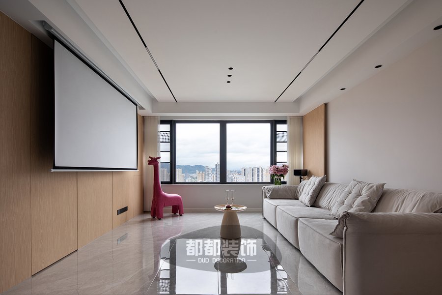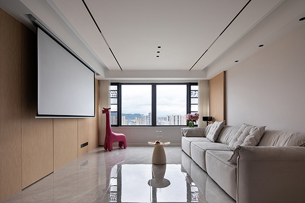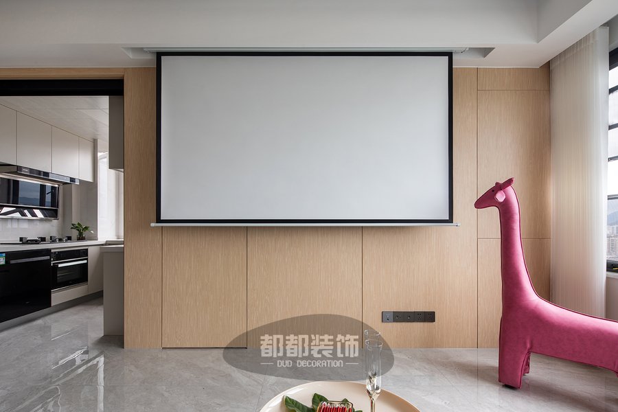 电视墙采用温暖榆木做隐形背景,投影+幕布+隔板墙,在家轻松拥有影院效果。