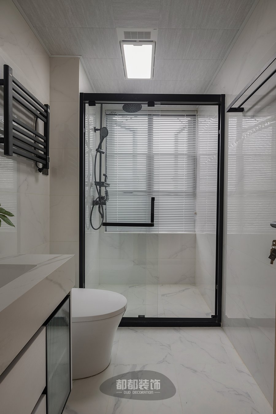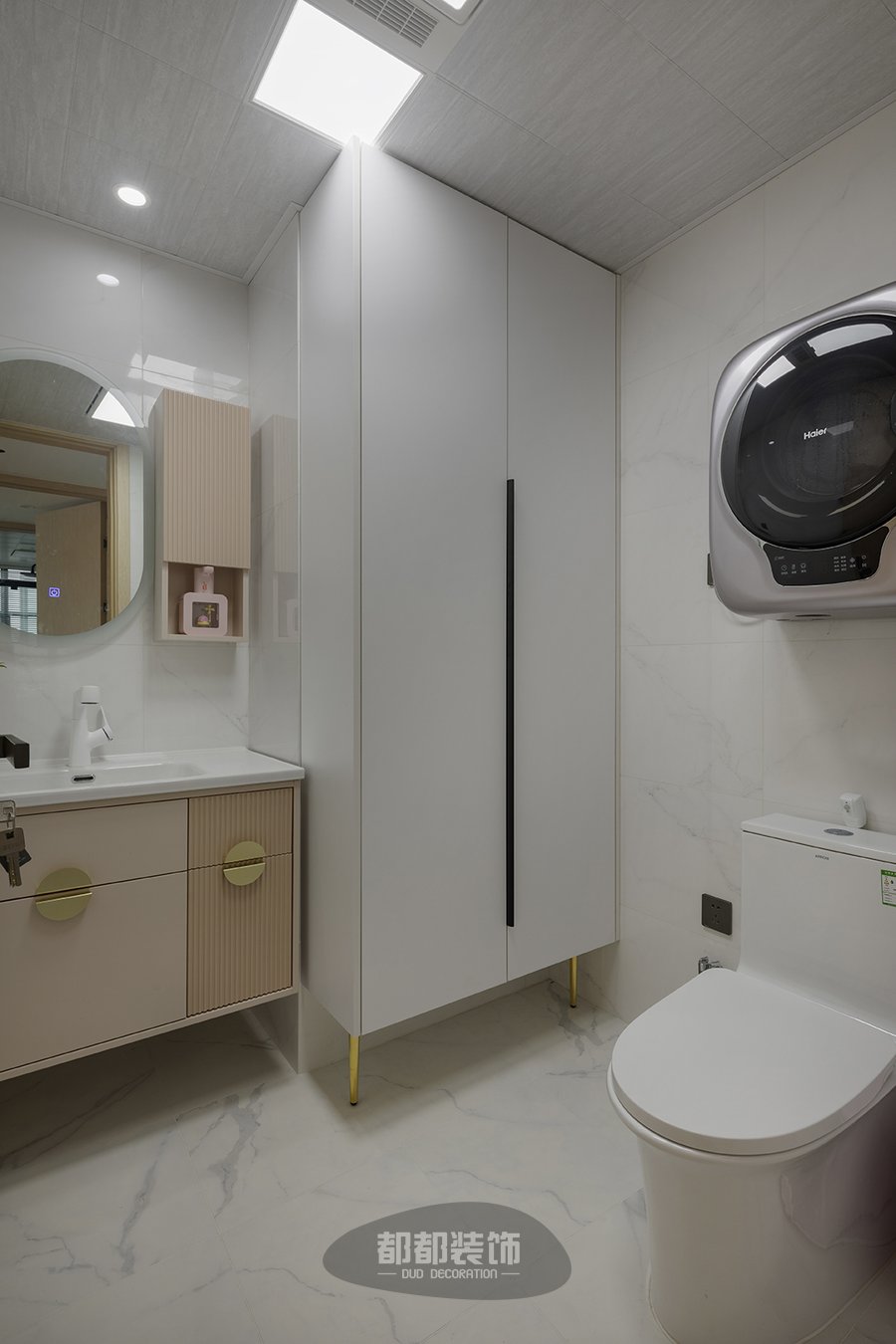 卫生间干湿区做了玻璃隔断,转角放置顶天式柜体,日常生活用品的囤货都可以收纳在里面。