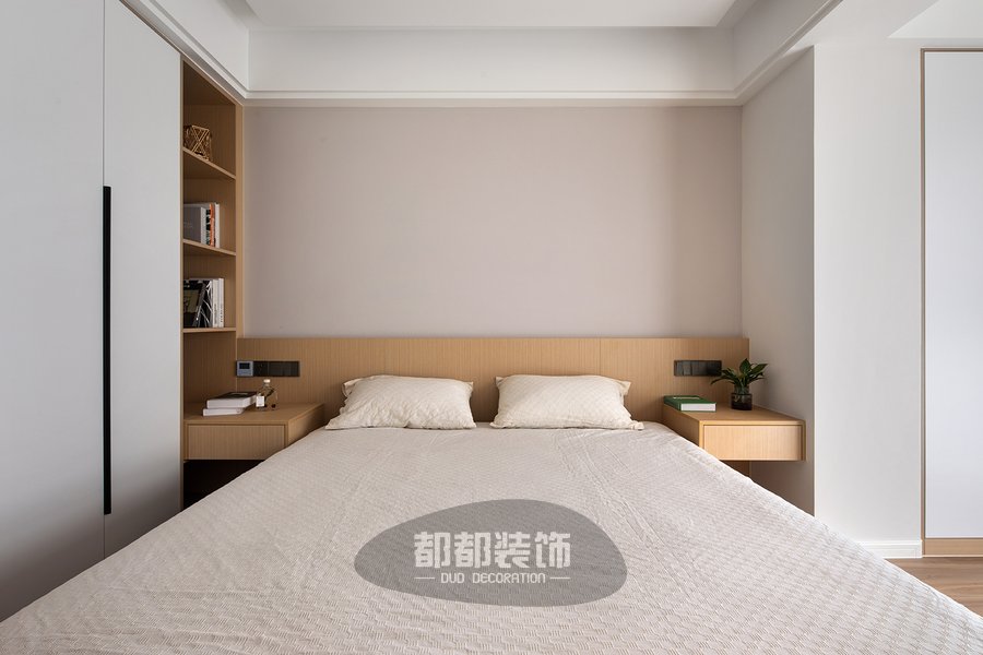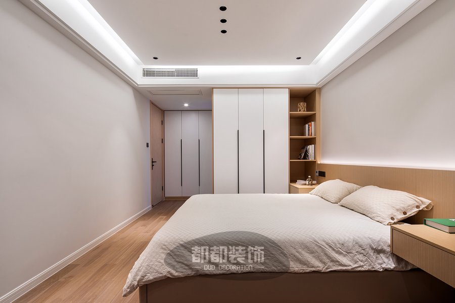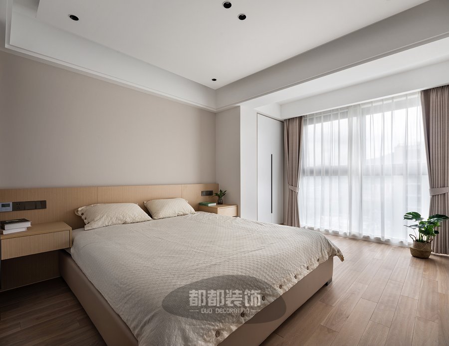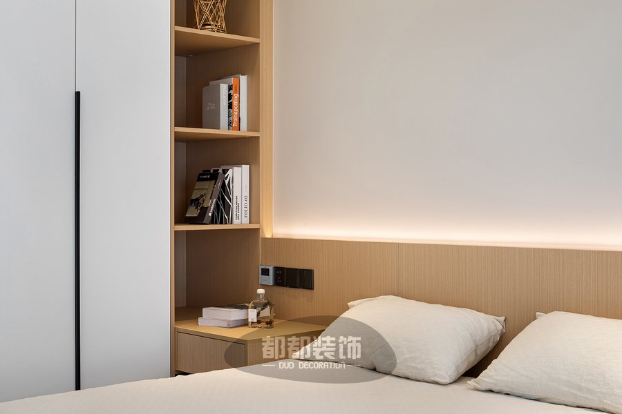 主卧的设计剥离外界的纷繁复杂,更多的融入木质元素的色调,温暖的自然光线游走在整个空间里,整个卧室的装饰主要集中在床头背景墙,选用清爽原木和暖色灯光烘托浪漫的氛围。