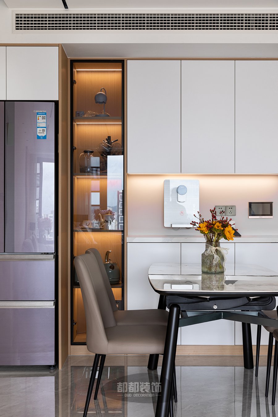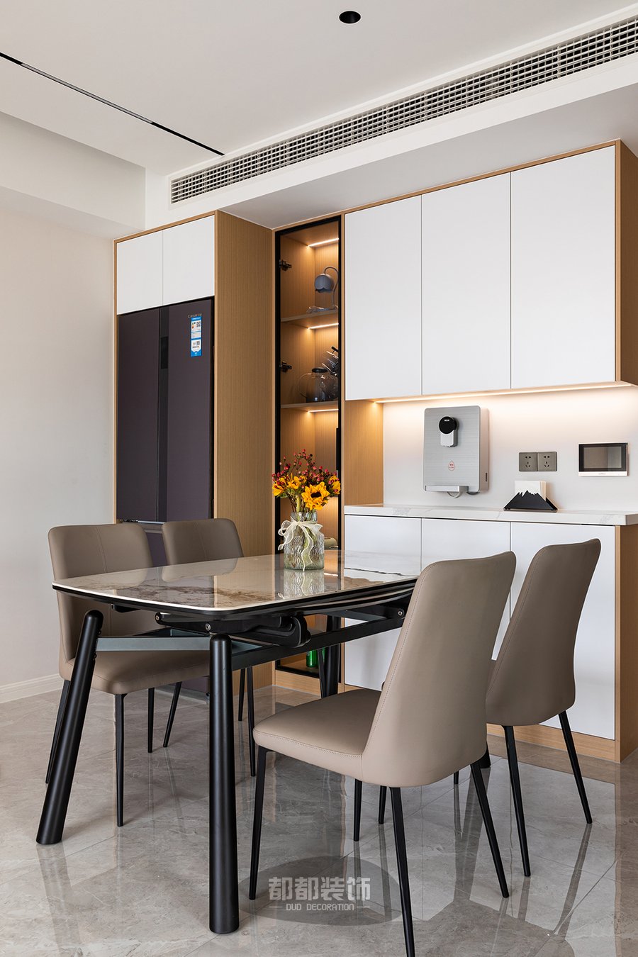 将岩板作为餐桌材质,配合软包餐椅,用了不同材质去碰撞,用木材的温暖质感中和岩板的刚硬感觉,满足不同的功能需求,也塑造了视觉上的延伸感。