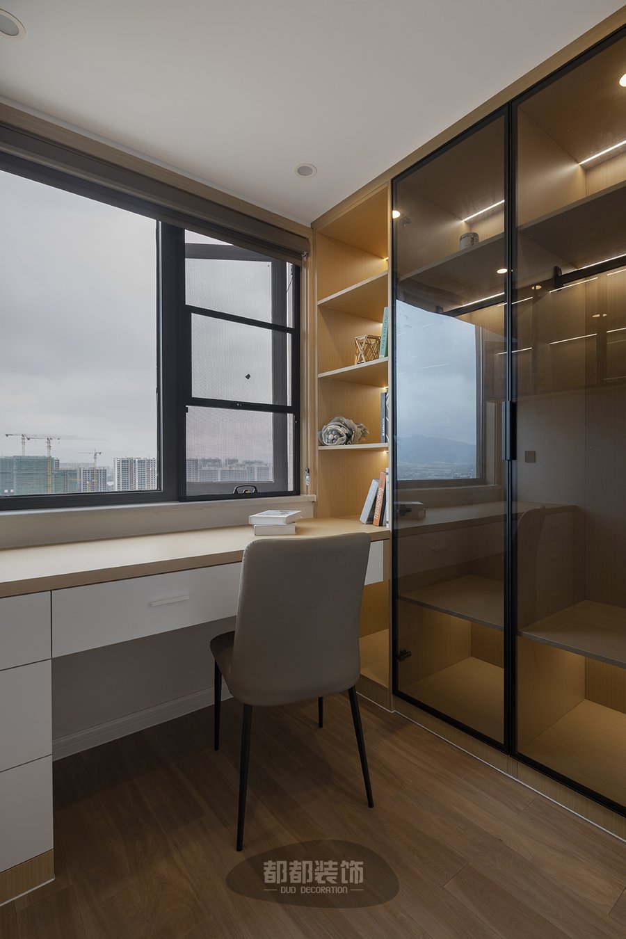 将衣帽间改造成书房,右侧整面的定制柜体可以收纳日常杂物,功能强大,结实的书桌不管是阅读还是学习都是非常惬意的。