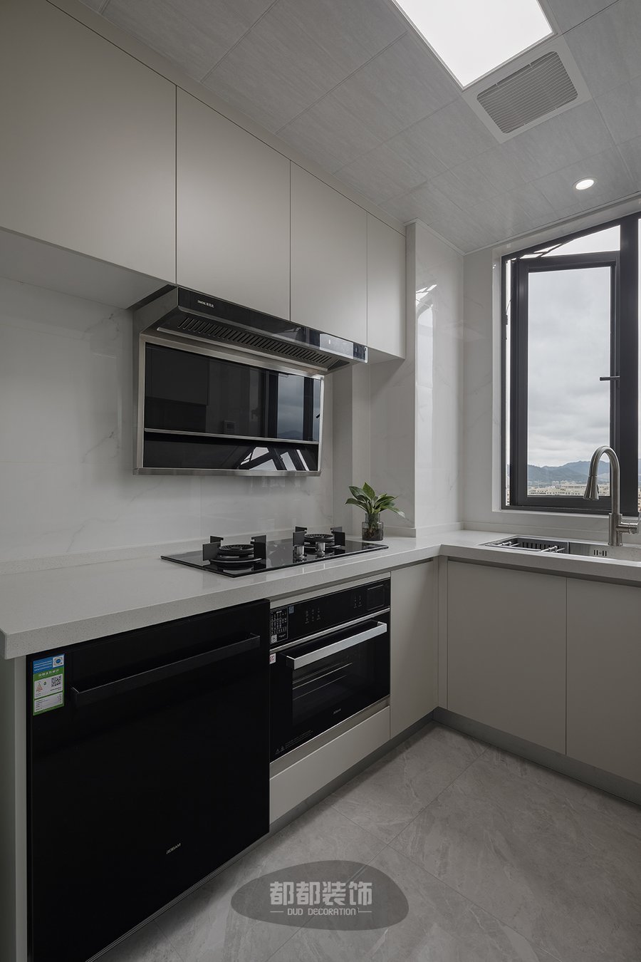 厨房没有多余的阻隔,大理石墙面、白色橱柜组合成空间的体块,有一种低调简约的质感,U型的对称布局增加了操作台的面积,放眼望去有一种协调的美感,配以窗外辽阔的风景,整个画面和效果图相似度竟达到99%。