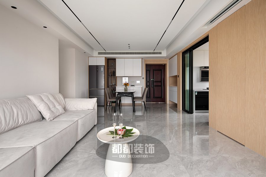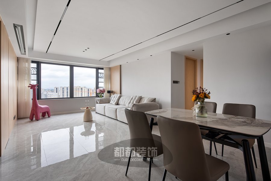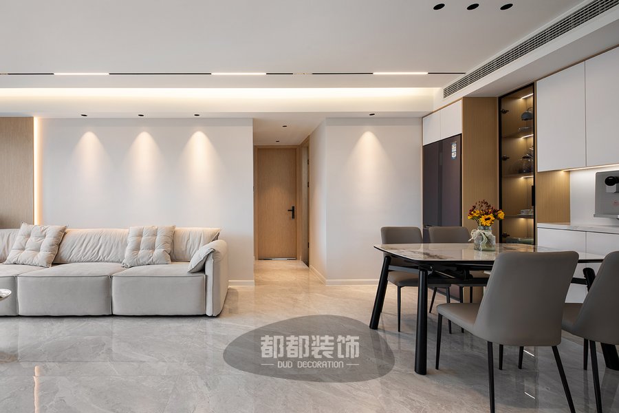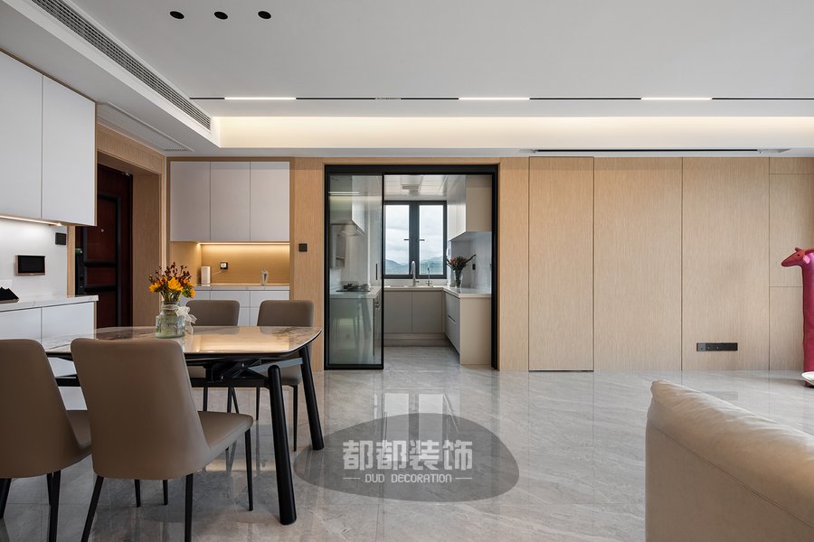 客餐厅一体设计开放性强,容易激发出多样的设计理念,一字型格局视野更加开阔,流畅的空间动线为家人们就餐创造了更多互动和乐趣。