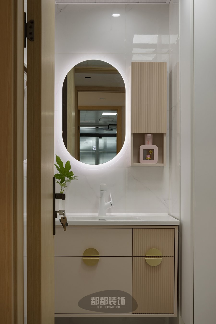 谁说浴室柜都是千篇一律的黑白灰?今天就带你重新解锁另外一种温馨的奶咖配色,储物侧柜+开放储物柜简直就是杂乱空间的终结者,独特半圆形金色把手,简约大气更显奢华。