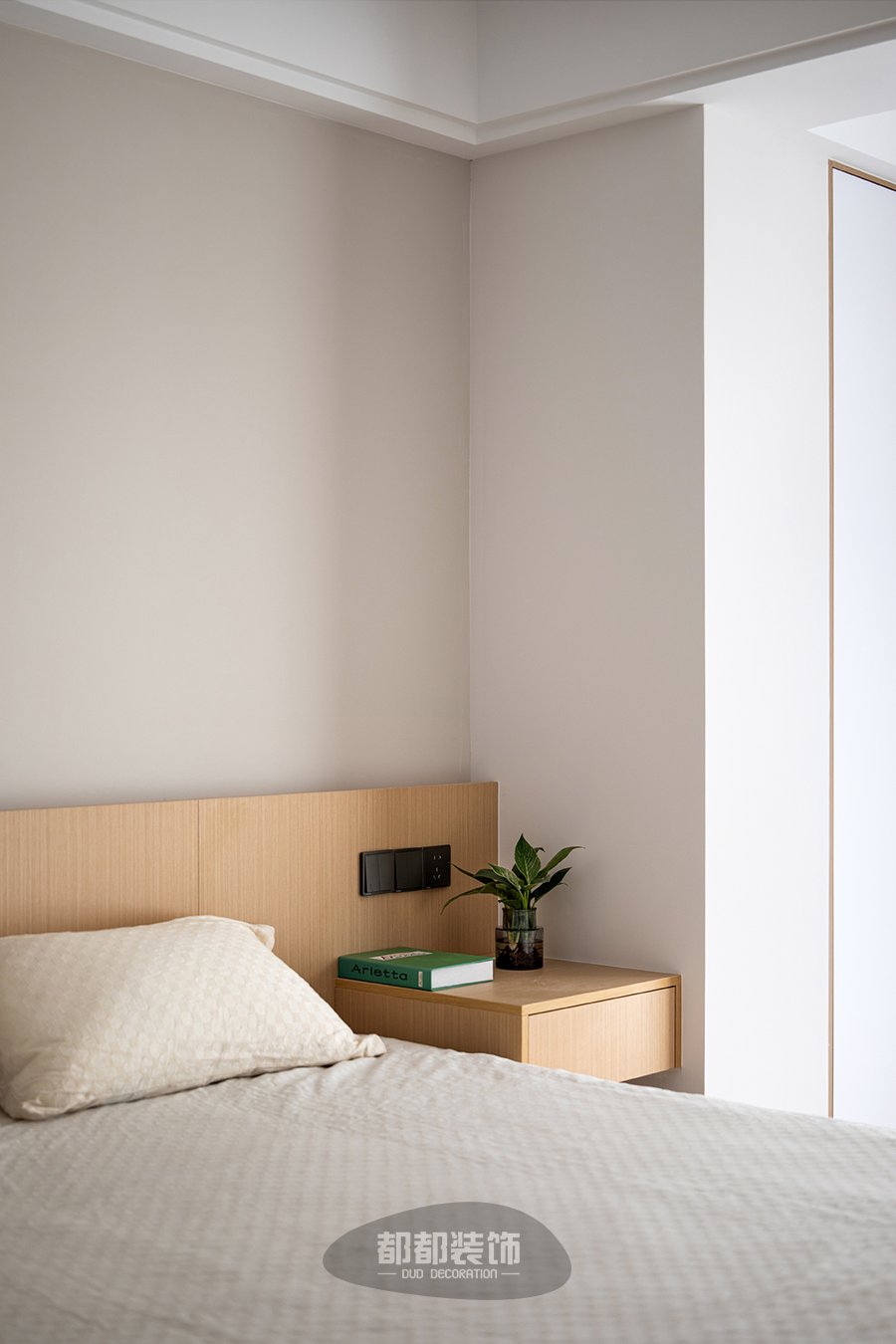 悬浮床头柜直接和床头板连接,摆上小绿植和助眠香薰,心被漫进的自然光线包裹,舒适、温暖的感觉伴随着漫落的晚霞带人走进温柔甜美的梦乡。