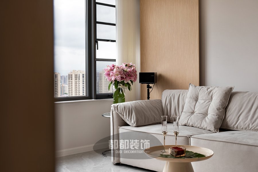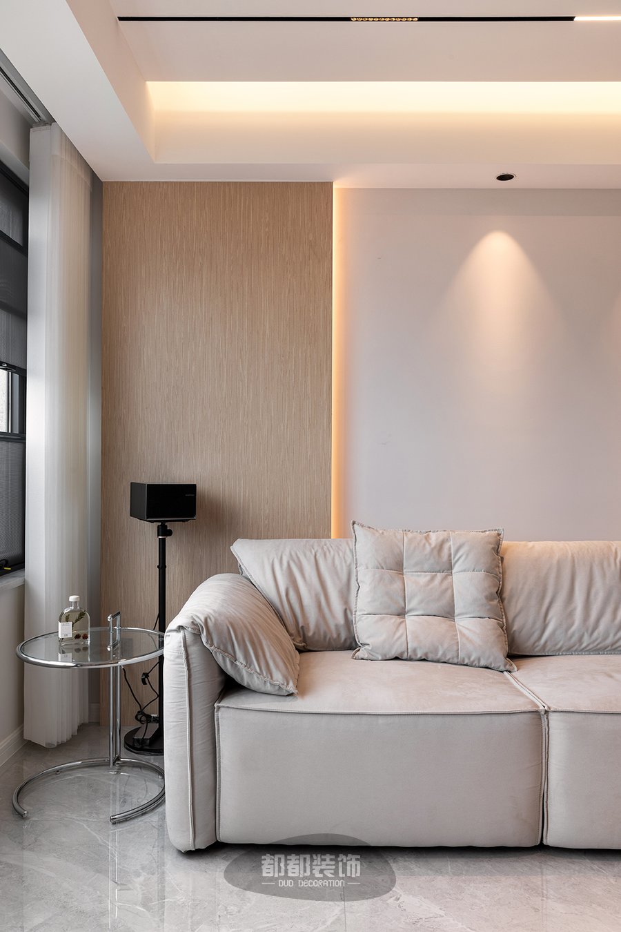 沙发背景墙是1:2的原木、白墙拼接设计,米白色科技布沙发与木色背演绎出空间的脱俗和高级感。