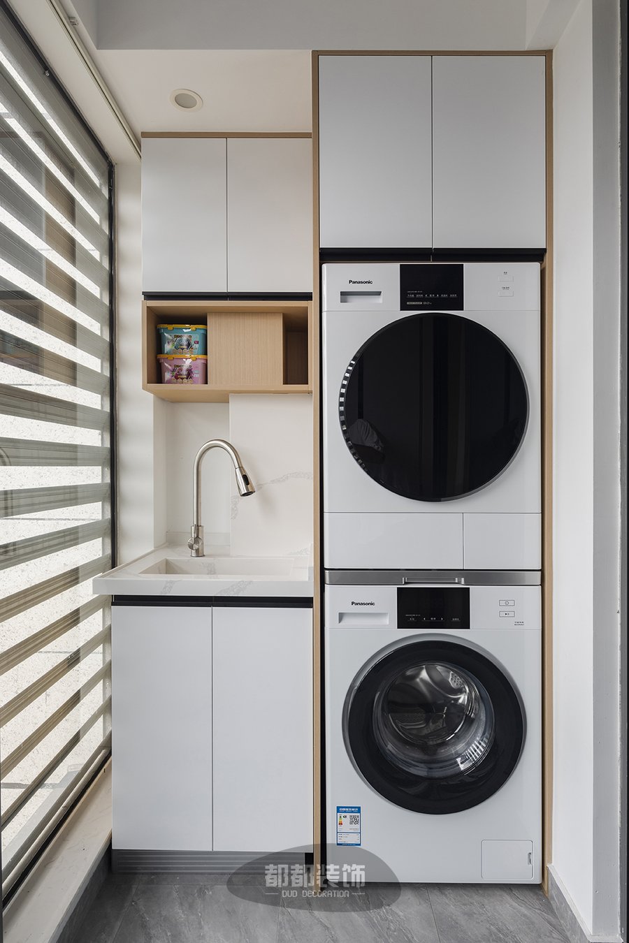 阳台区的收纳功能也很nice,地柜+开放柜+吊柜可以将生活的清洁用品收纳其中,保持阳台的干净和整洁。