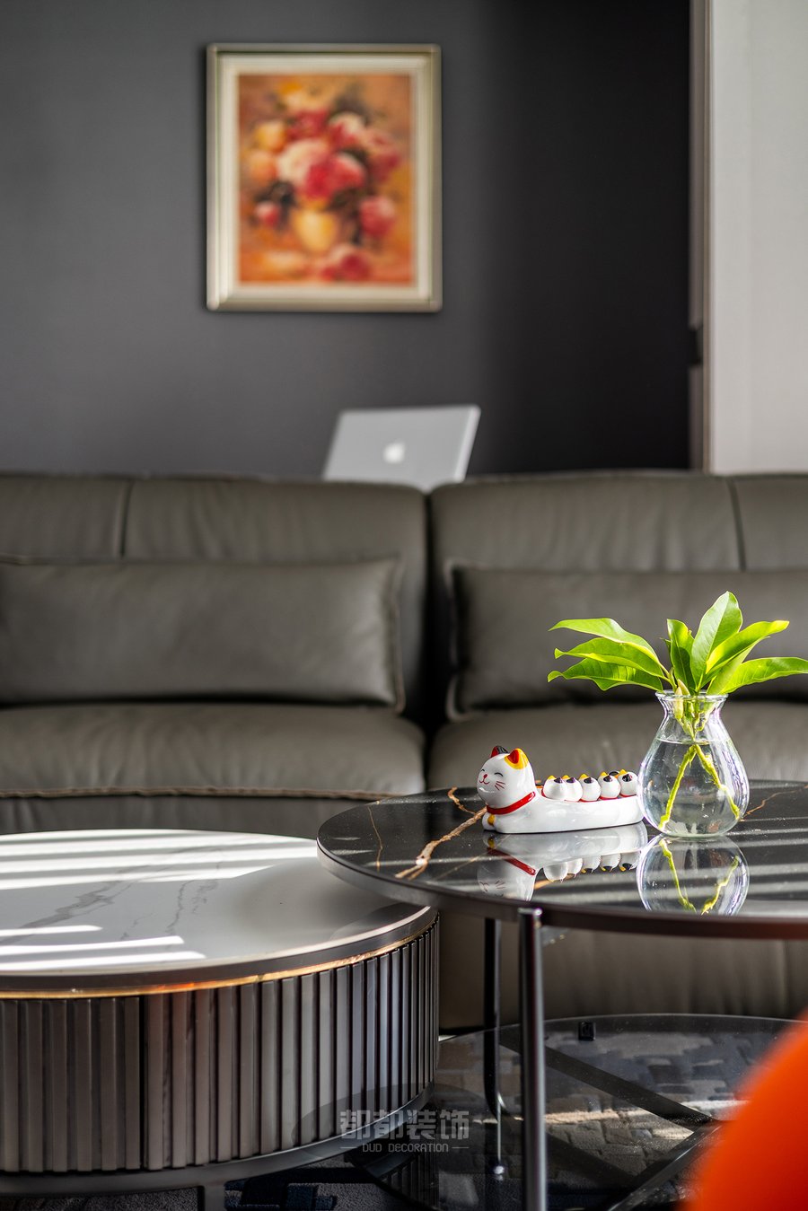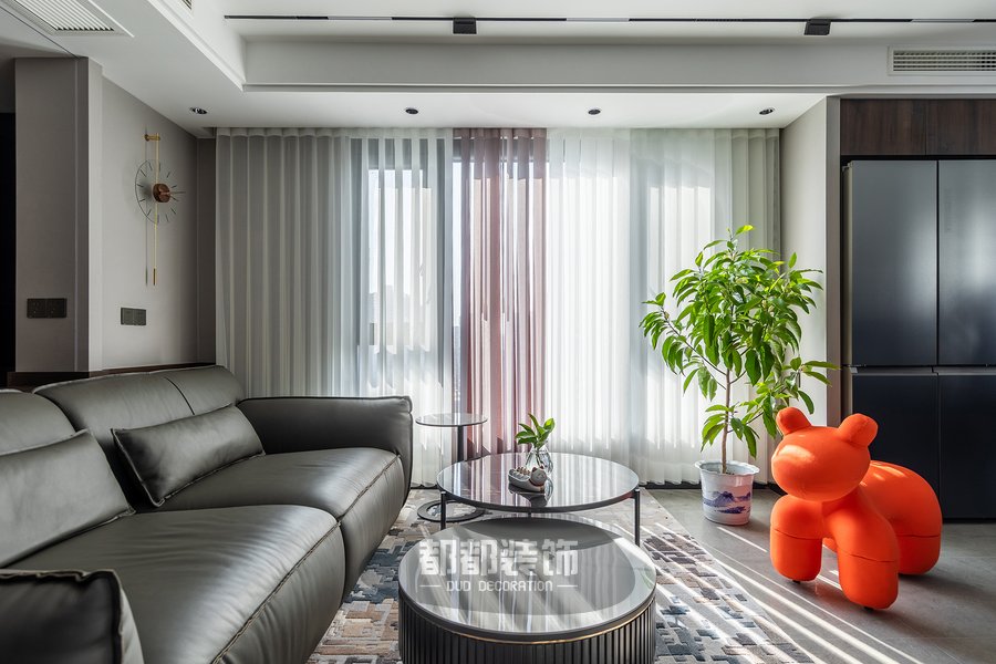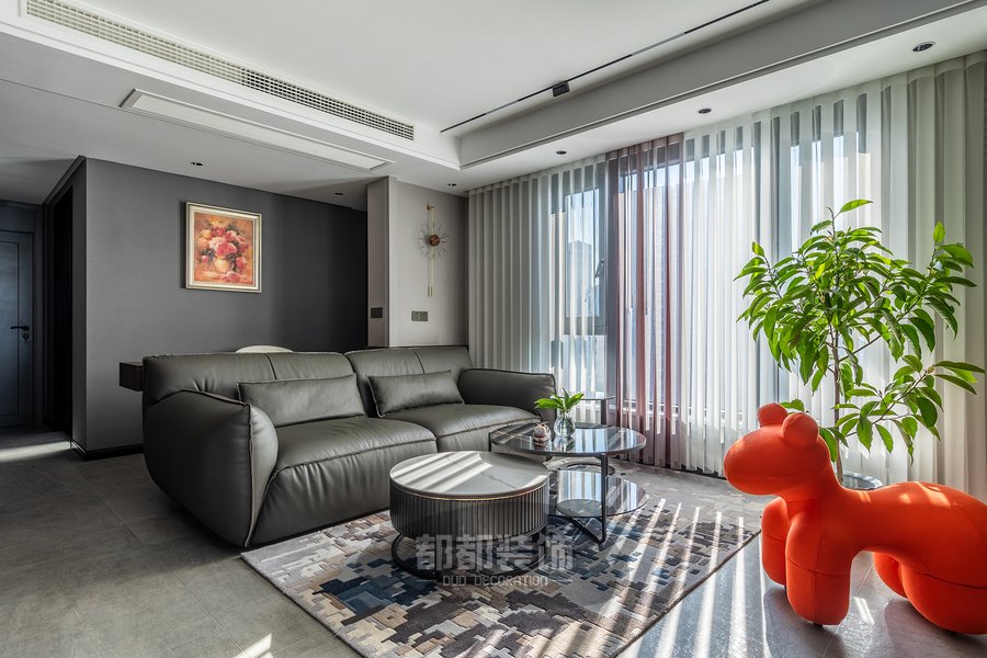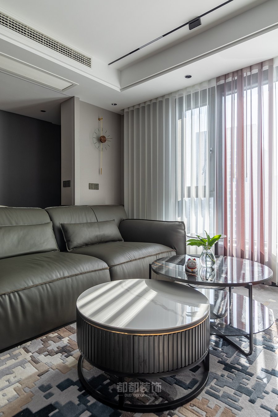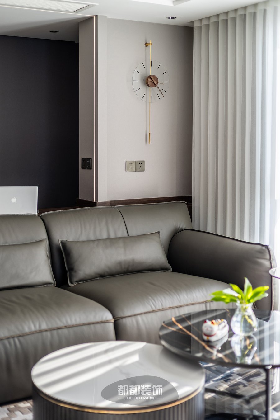 落地窗和极简吊顶起到拉高楼层的效果,在软装沙发的选择上,延续了灰黑的主色调,以简洁的造型、完美的细节,营造出时尚前卫的感觉。