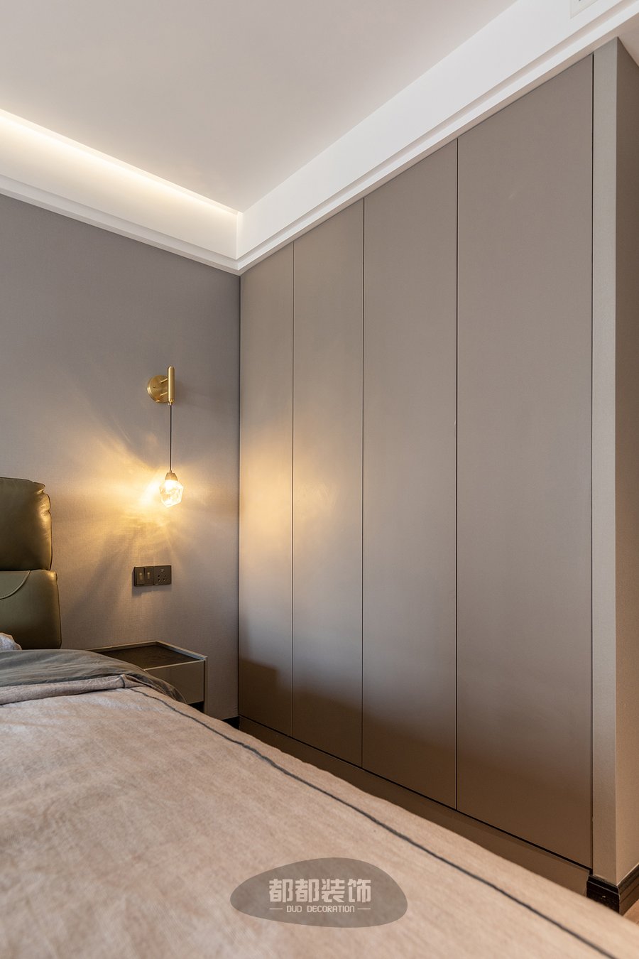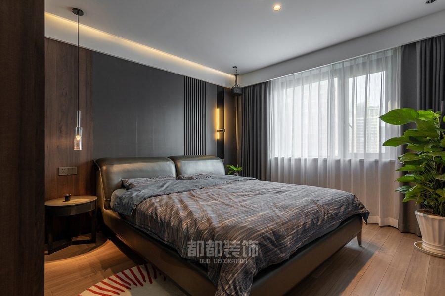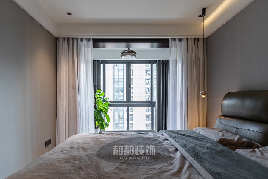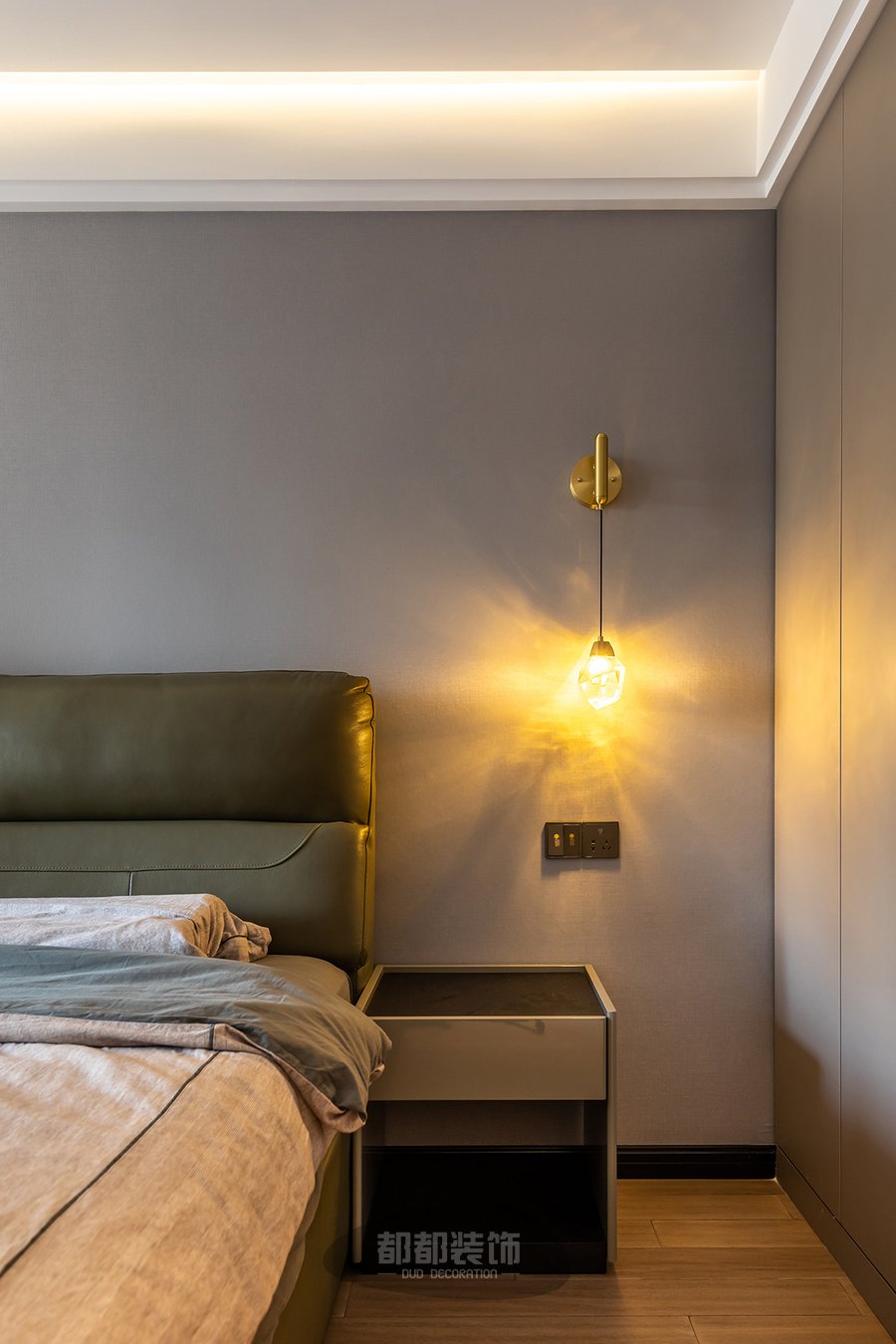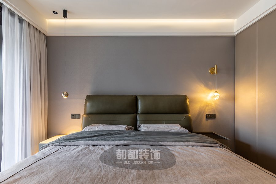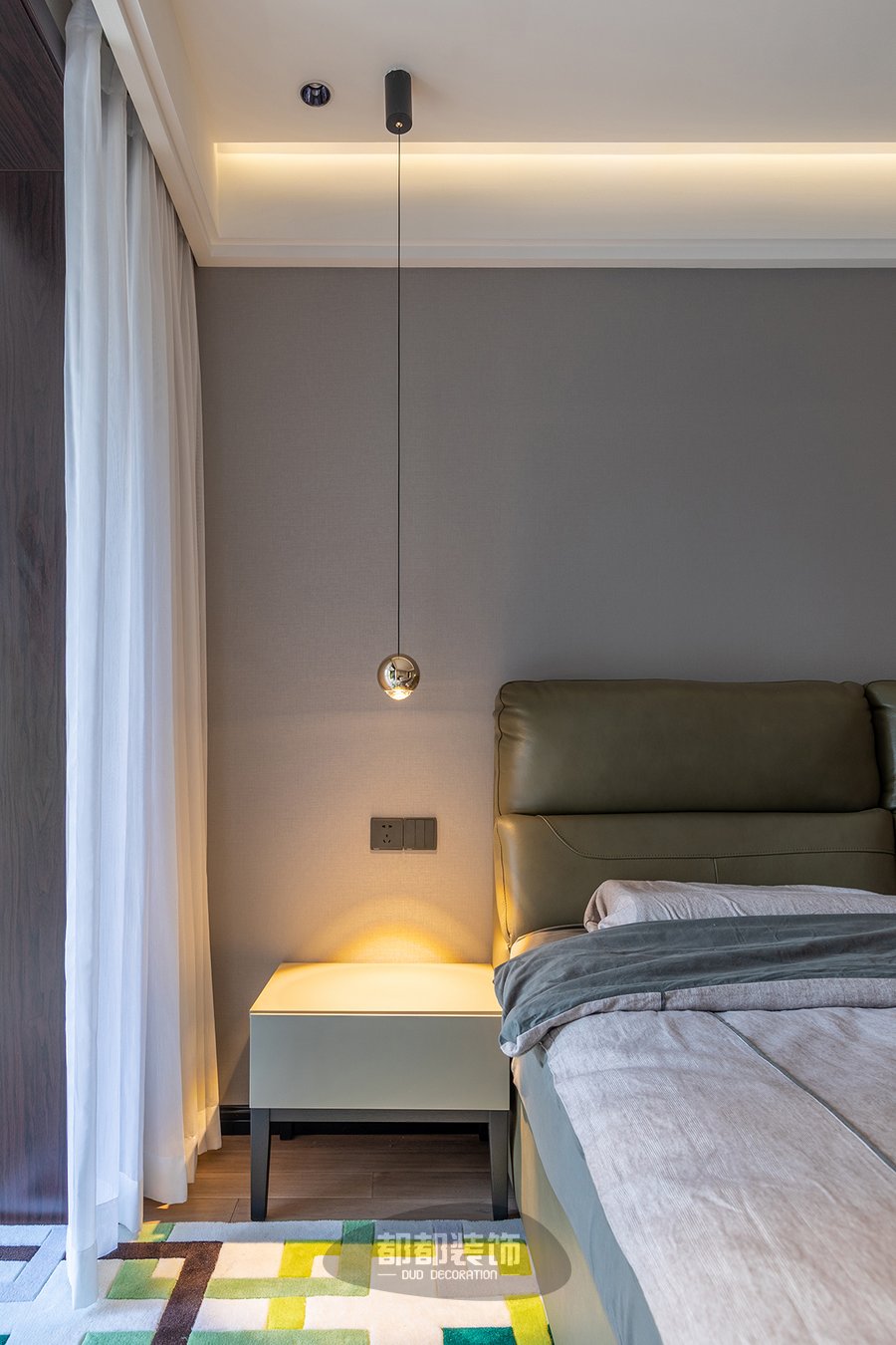 次卧因为有阳台的加持,整体空间宽敞透亮,灰色背景墙没有过多的铺陈,两侧玻璃吊灯让你体验到光线游走不受拘泥的畅快感受。