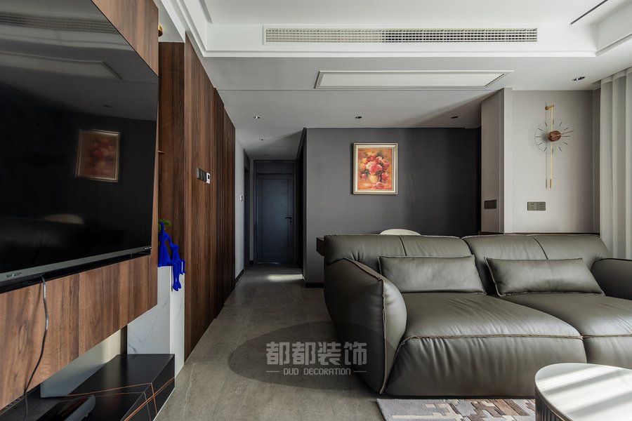 一字型悬空电视背景墙相较于整墙电视柜,它减少了大面积柜体带来的厚重感,更大气简约,和玄关柜统一的橡木色材质还能从视觉上拉伸空间,降低沉闷感,因为不占地基本上不会留下卫生死角,能让客厅空间时刻保持干净整洁。