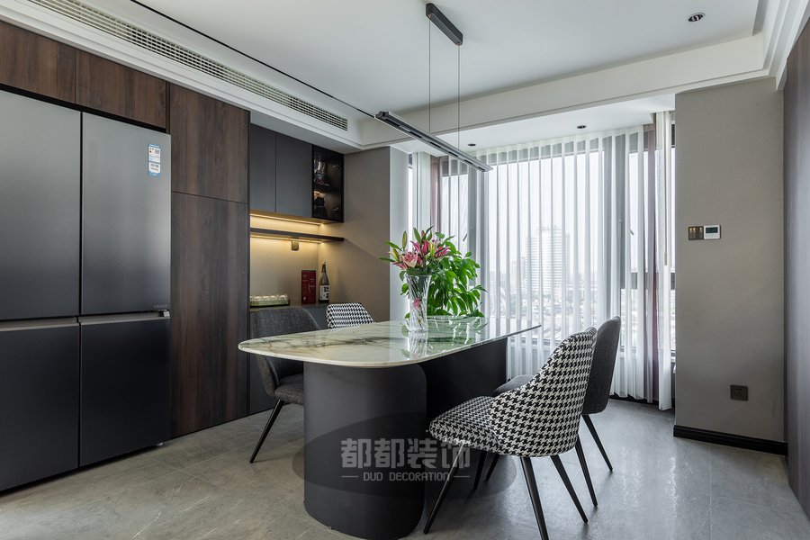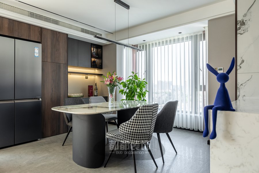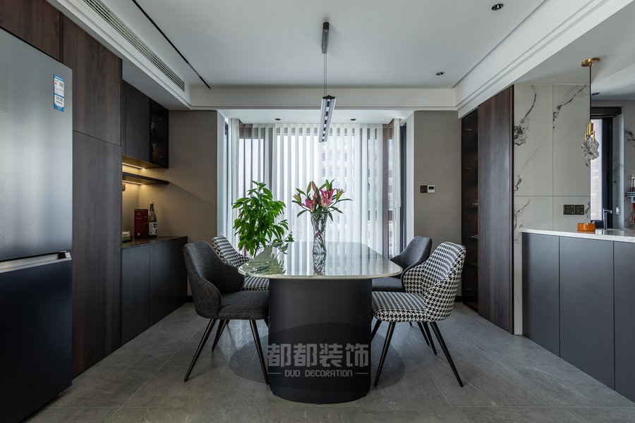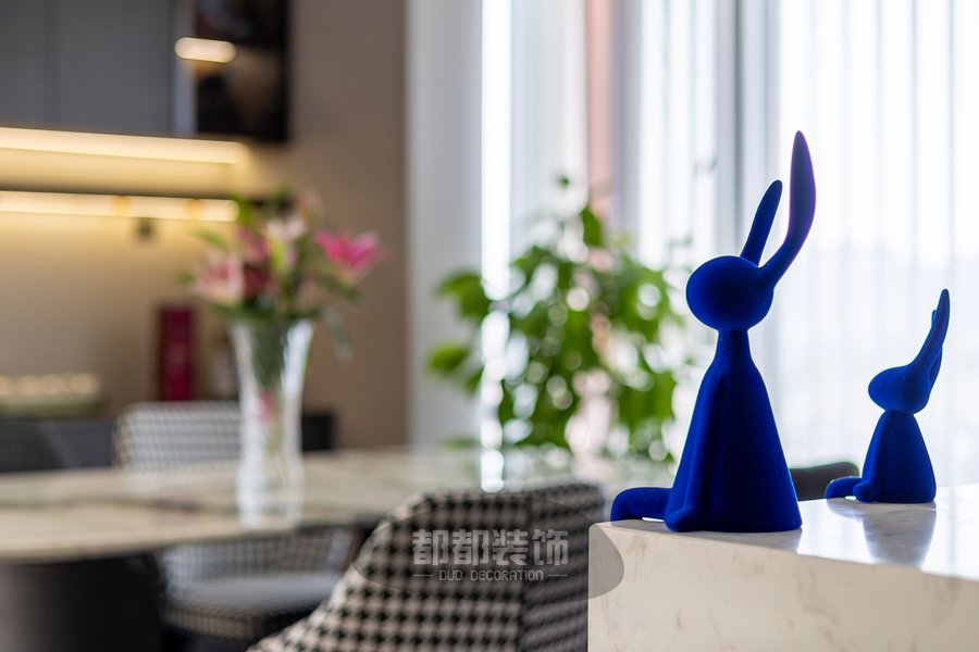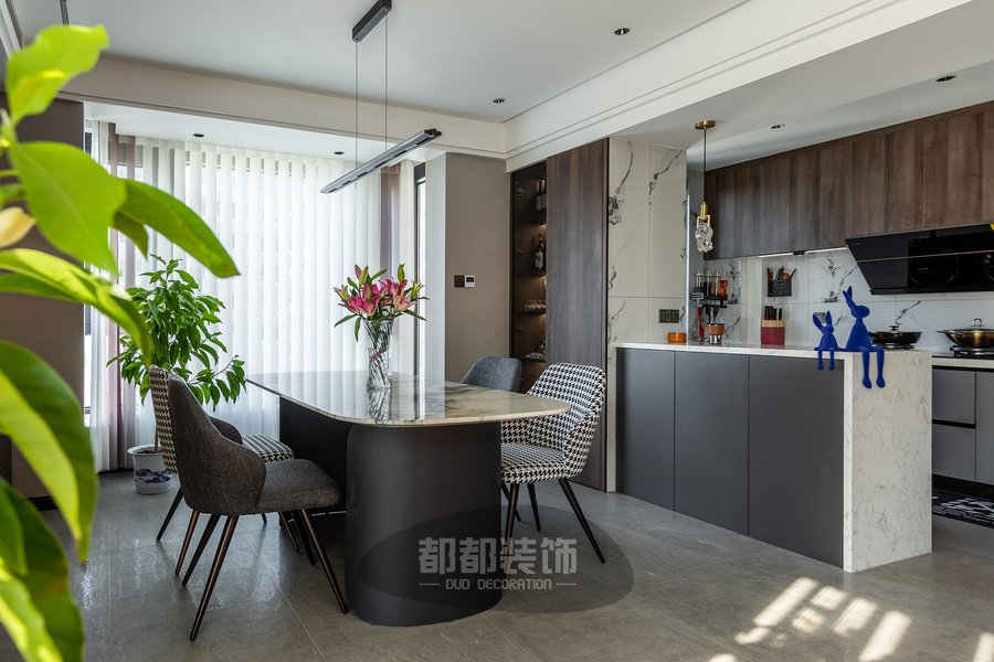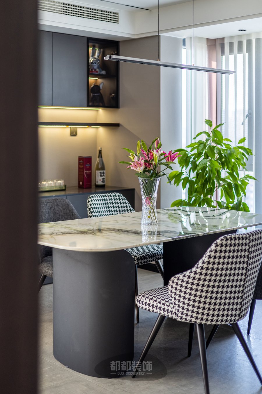 白色岩板餐桌搭配黑白千鸟格餐椅,一字型吊灯和艳丽的百合花营造出空间浪漫、时尚的气氛,光线洒在桌面上,星星点点似银河。