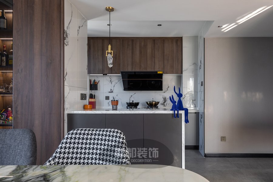 厨房整体是L型的走向,延伸出来的吧台作为出餐区,使用率超级高,平时施小姐也喜欢请朋友来家里聚,做饭的时候和客厅的人还能交流交流,不会有那种大家都在客厅玩就施小姐一个人在厨房忙活的感觉,氛围更好了,而且开放式厨房就是会给人一种开阔的感觉。