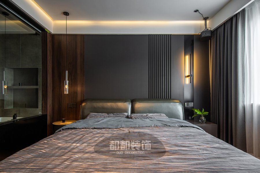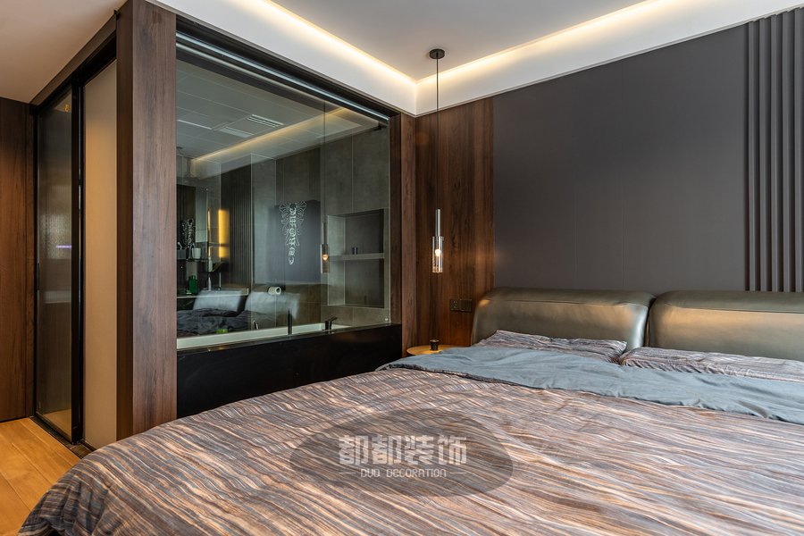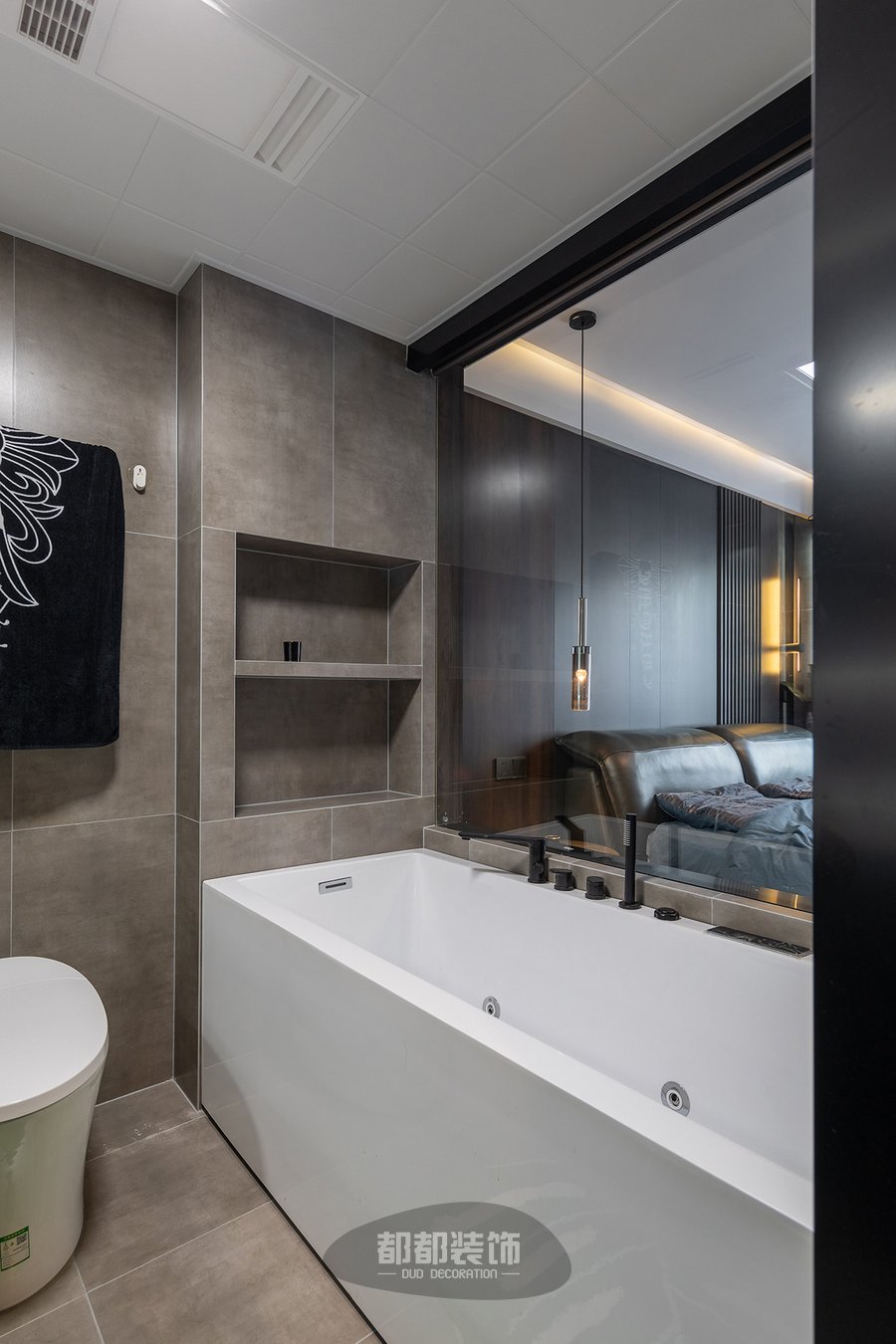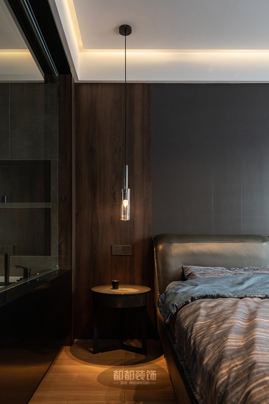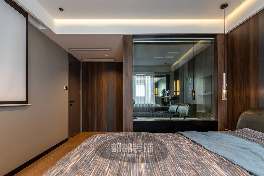 为了保证空间的采光与通透性,主卧卫生间大胆地采用了“雾化玻璃”为隔断,使用时用雾化效果,完全不用担心隐私问题,床尾墙壁安装了投影装置,阴雨天在这样暗色系的房间里看上一部电影,超级惬意!