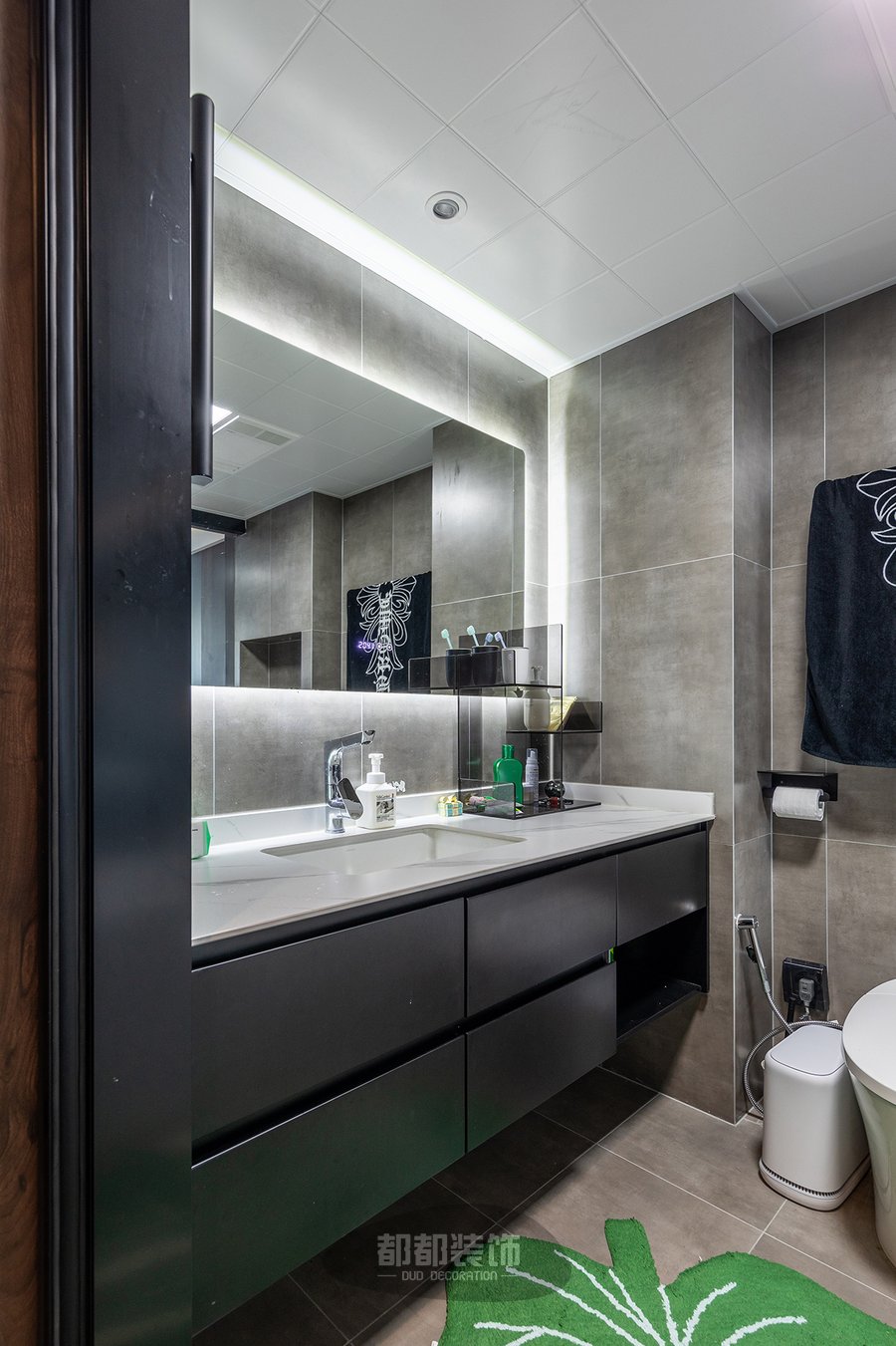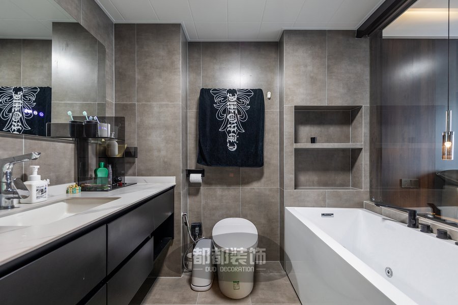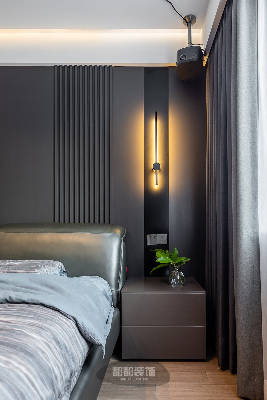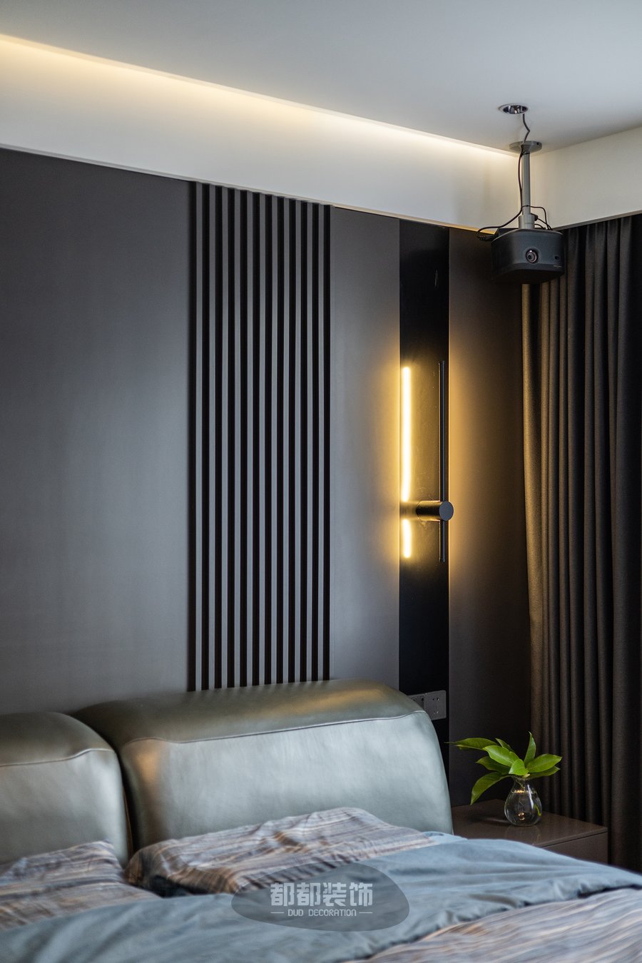 为了保证空间的采光与通透性,主卧卫生间大胆地采用了“雾化玻璃”为隔断,使用时用雾化效果,完全不用担心隐私问题,床尾墙壁安装了投影装置,阴雨天在这样暗色系的房间里看上一部电影,超级惬意!