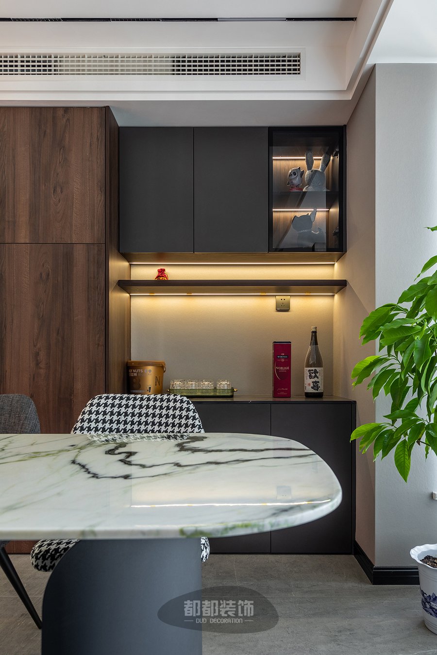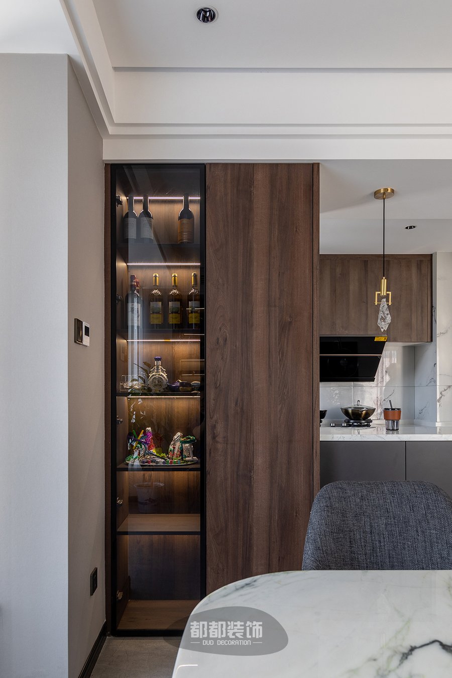 咖色橡木餐边收纳柜与客厅风格一致,满足空间收纳的同时进行装饰,玻璃门+暖光灯带的搭配,让简单款也能焕发出经典时尚的气质。
