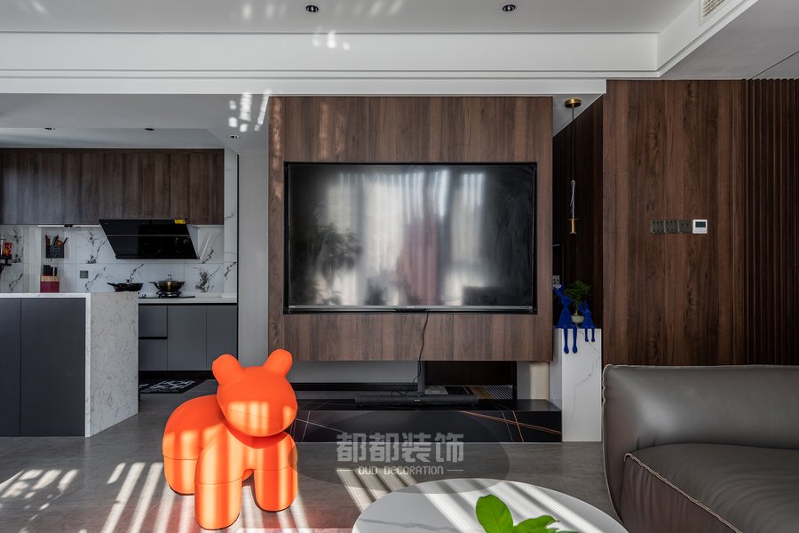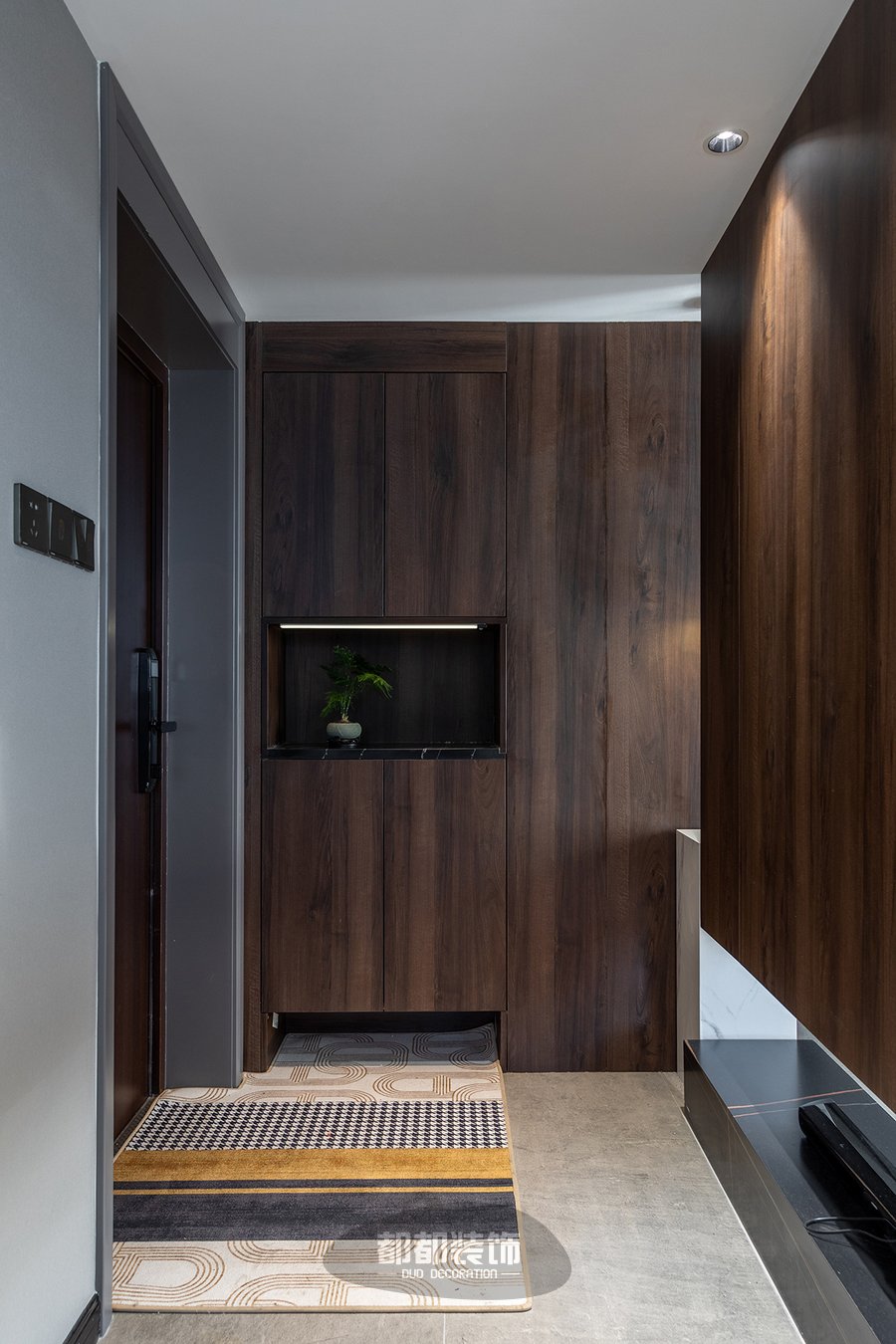 为了让施小姐进门有点仪式感,设计师在进门处做了别具一格的悬空玄关,同时玄关背面客厅的电视背景一起多用,一致的咖啡色原木材质让统一性更强,悬空的布局还给空间带来轻盈通透的视觉美感,她的话来说就是:很酷!