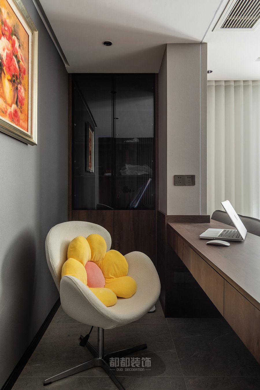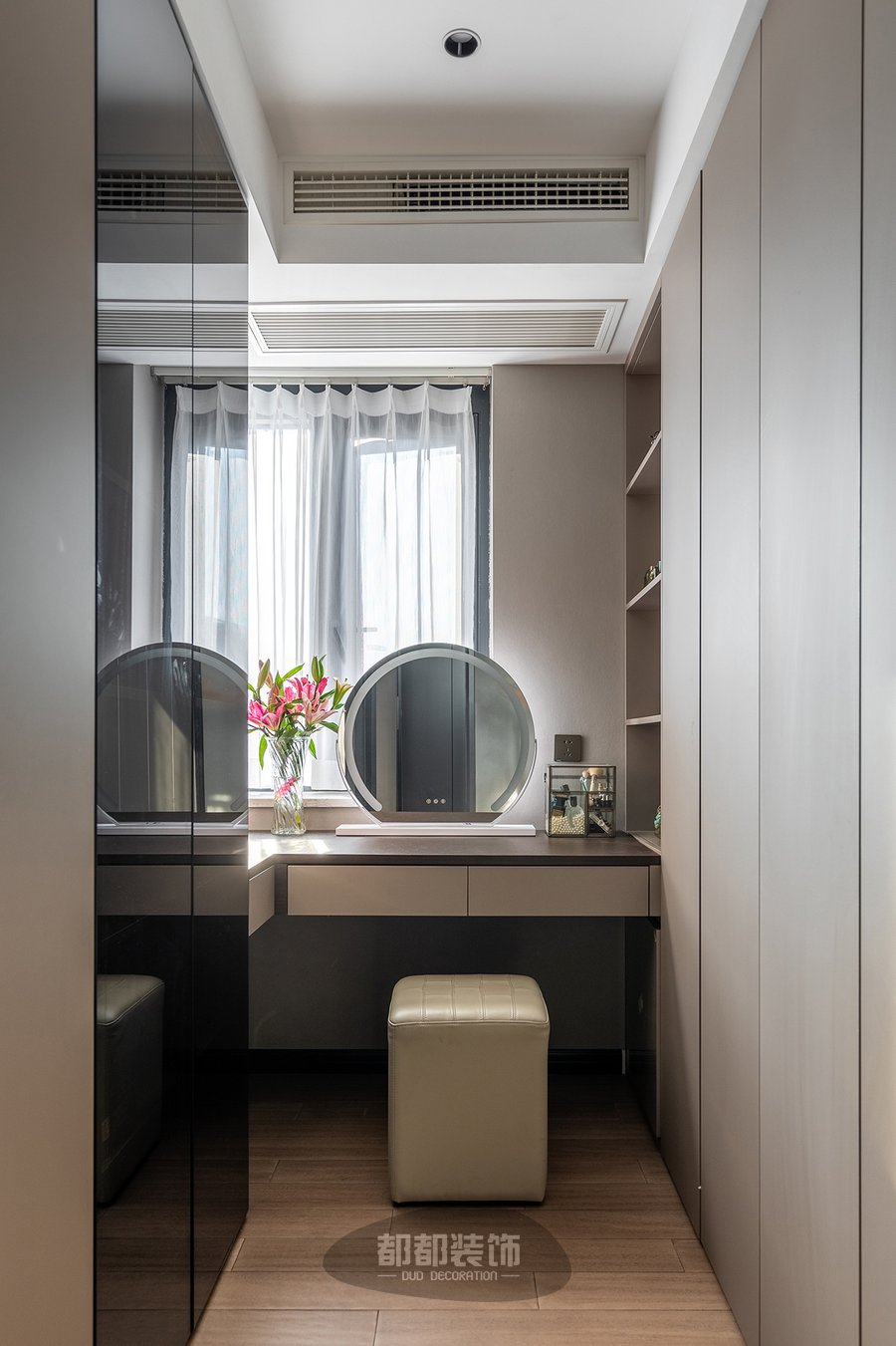 开放式书房后面是施小姐的衣帽间,空间虽小但各区域分配整洁有序,衣柜延伸出梳妆台,每一寸空间和材料都得到充分利用,靠窗的位置光线充足。