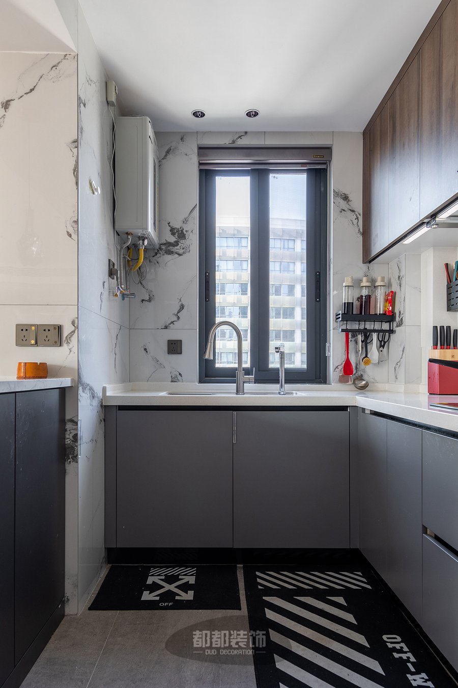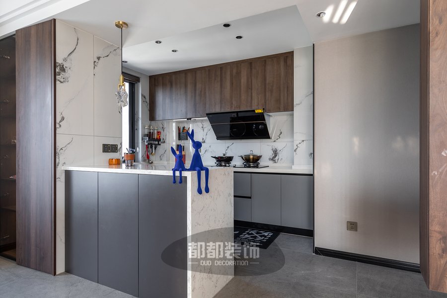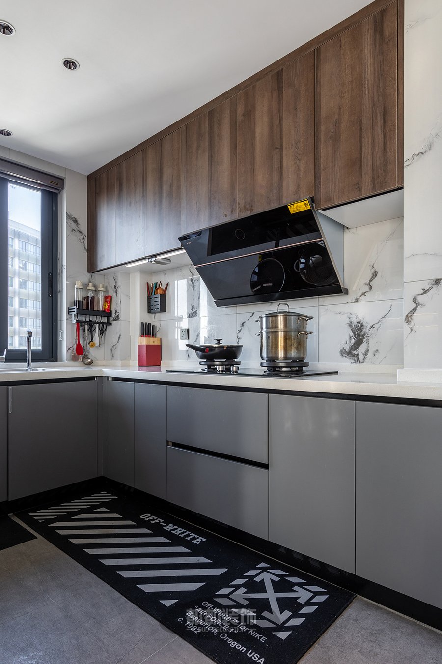 橱柜延续灰色为主色调,时尚前卫,小巧的抽烟机颜值很高,高柜做到顶设计+嵌入式厨电,收纳空间充足的同时保证空间视觉平整度。