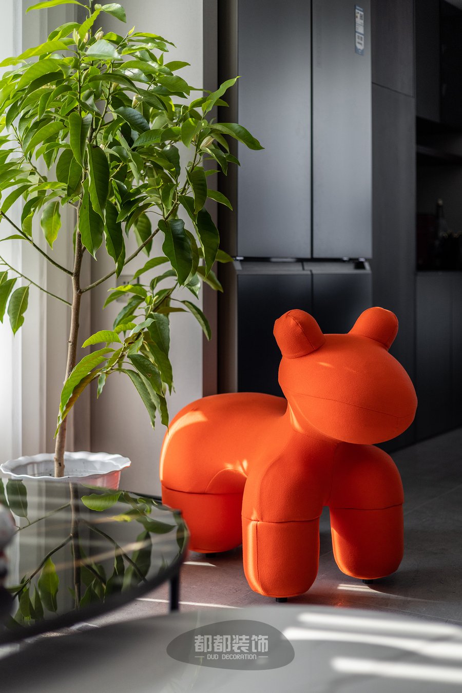 客餐厅是相通的,两个空间既有界限又相互沟通,远远望去,小马椅无疑是整个空间内的点睛之笔,跳跃的橙色活跃了空间气氛,造型圆润萌系。