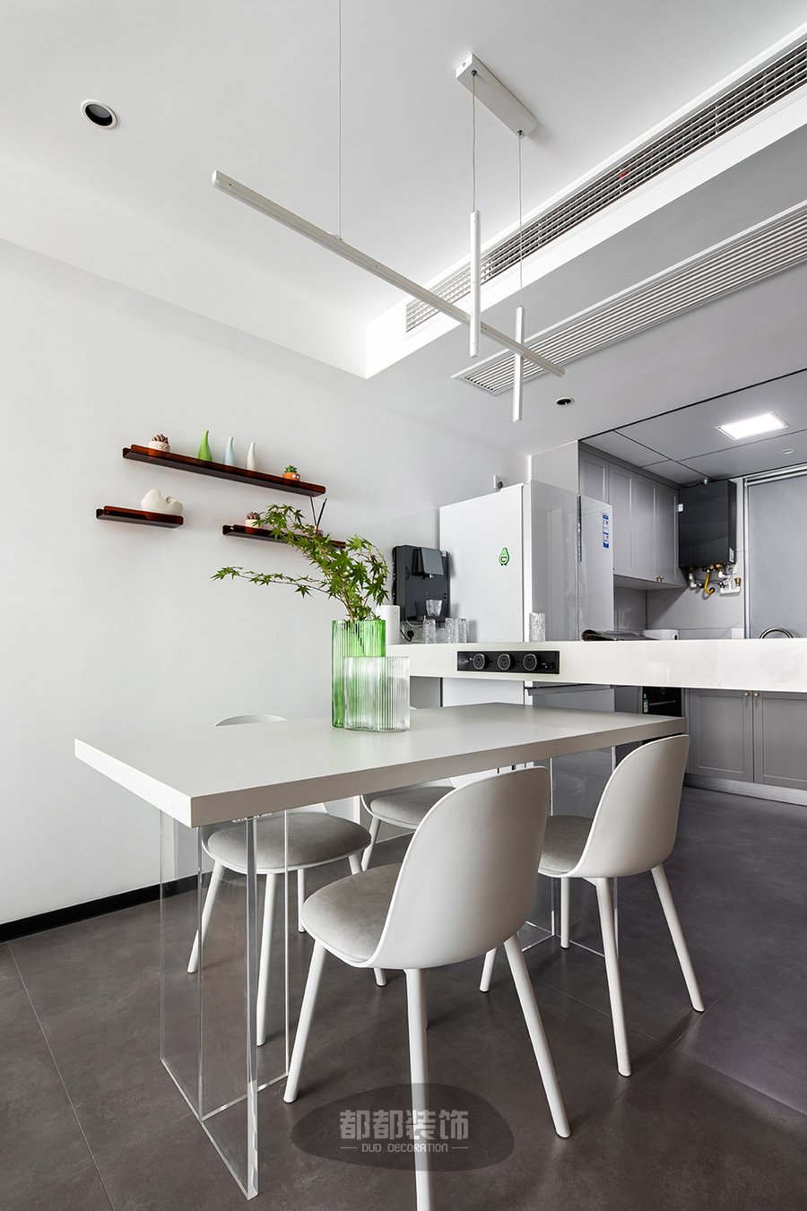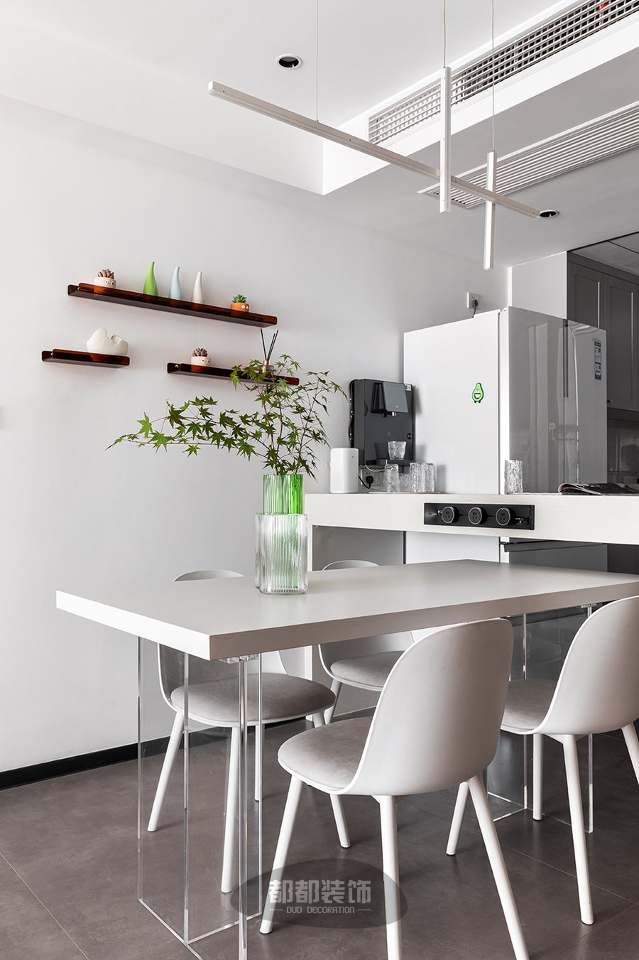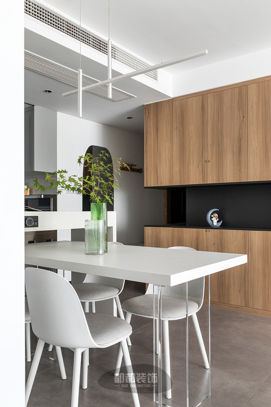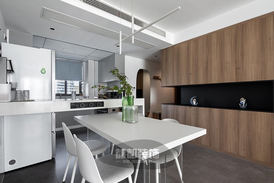 白色桌面+透明亚克力的餐桌,搭配简约软包的餐椅,简约中带了些许烟火气,让用餐时光显得更加惬意享受,长型吊灯视觉上减少了层高,近距离的温馨光线会让美食更加可口!