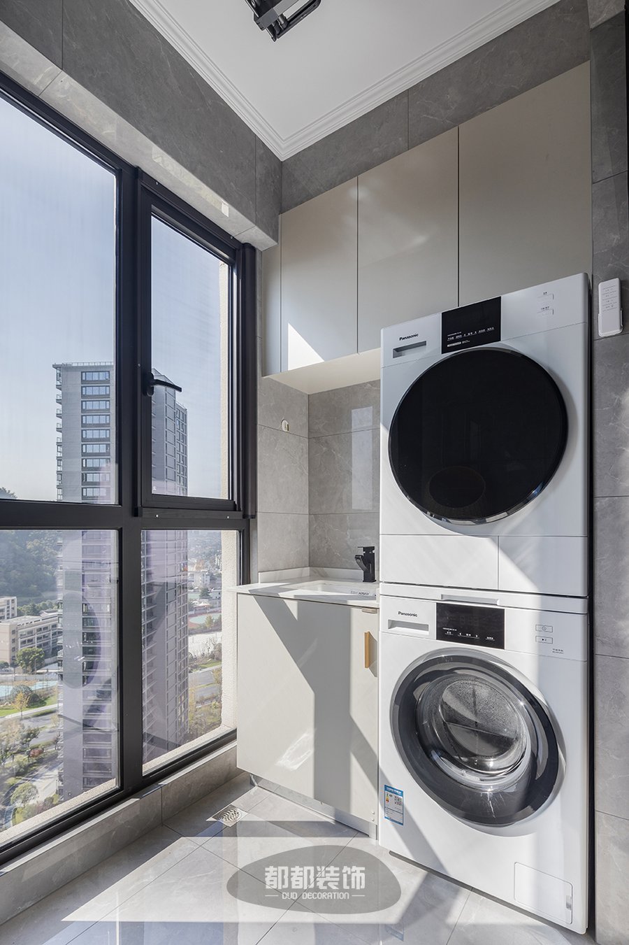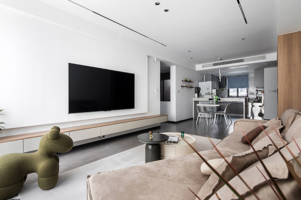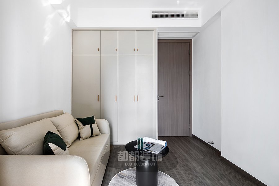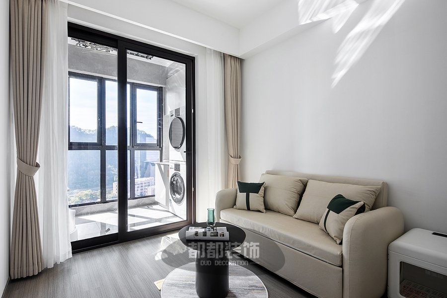休闲室以米色和白色为主,白色背景墙点缀一些米色沙发来增加空间舒适度,低矮宽大的造型简直是为舒适而生的设计,休闲室连接阳台有着绝佳的采光与视野,闲暇时坐在这里阅读、休憩、放空,舒适惬意;阳台作为洗衣生活角,让光线形成束映入室内,空间更加清爽干练。