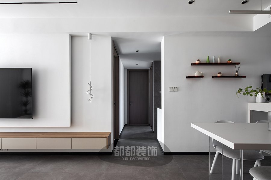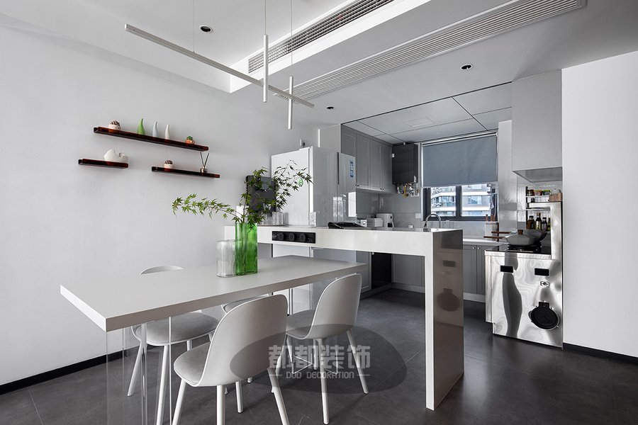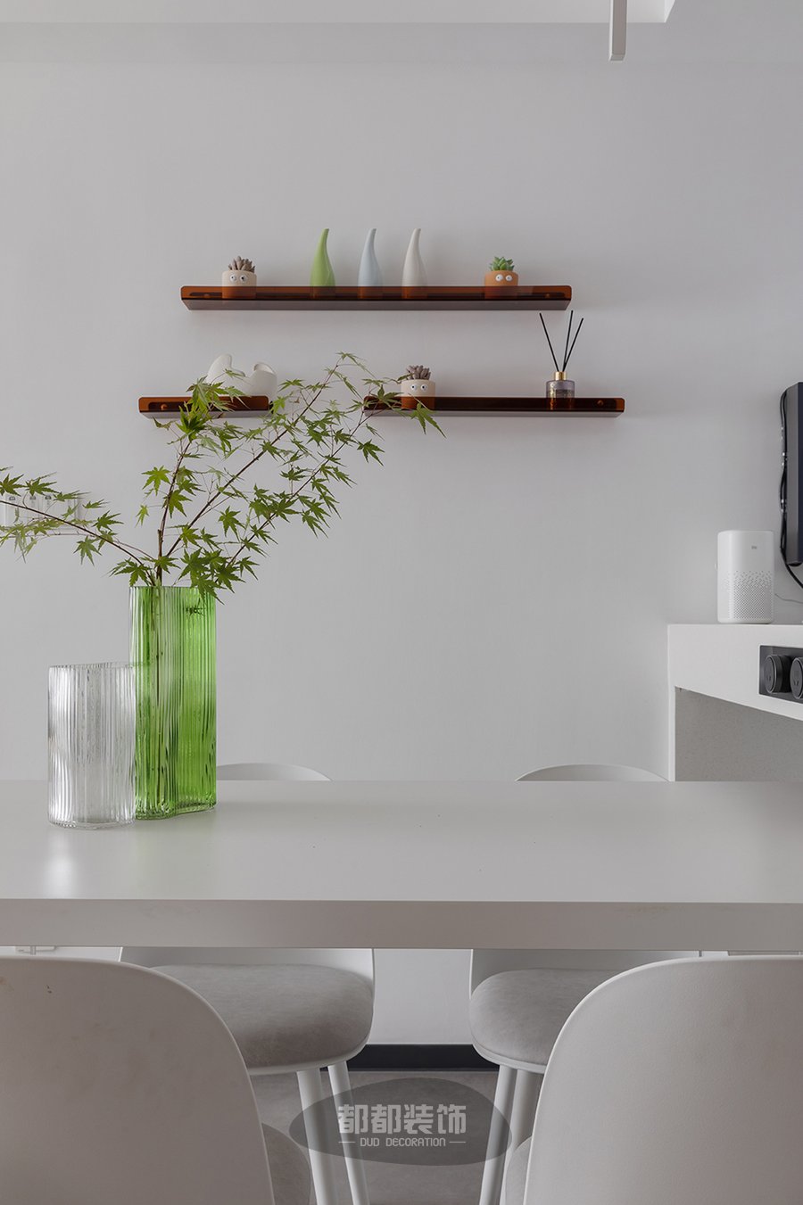 餐厅空间简单、安静,白色背景墙上安置着三块茶色隔板,点缀一些多肉和小陶艺,ins风十足,素白的餐桌椅搭配翠绿的盆栽,清爽的配色,有序的布局,将生活感与品质感密切结合,给人手可及的安心,将生活与乐趣融进房子里。