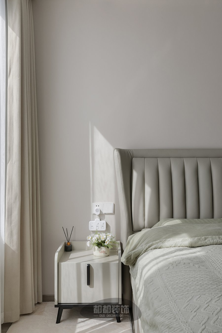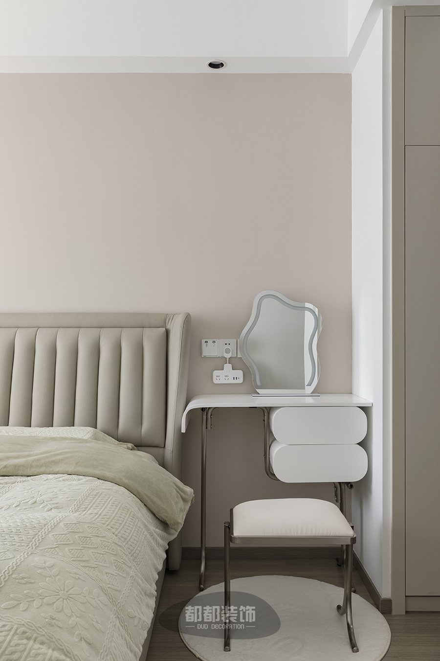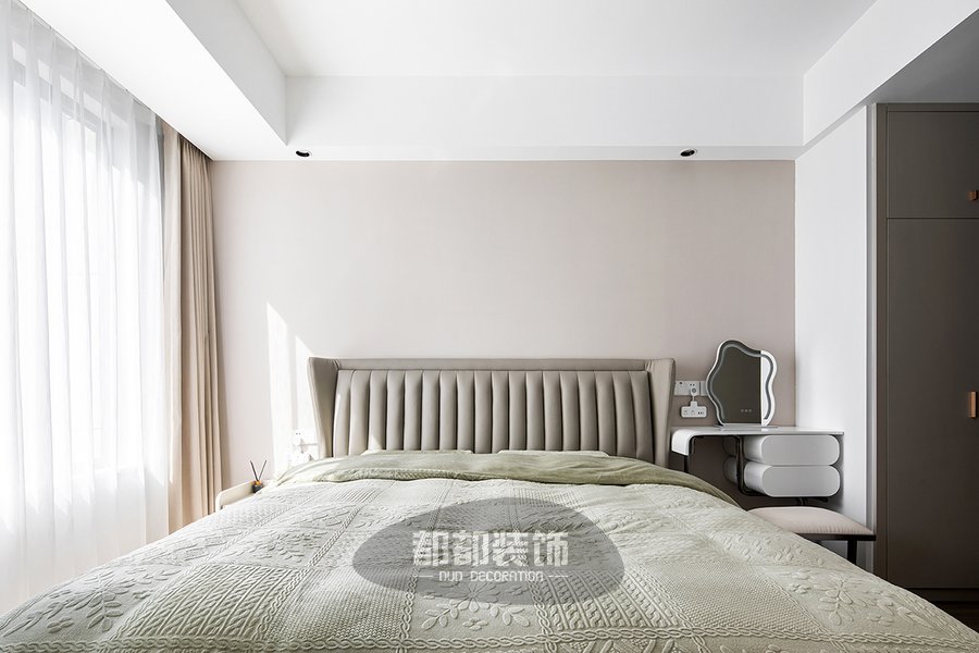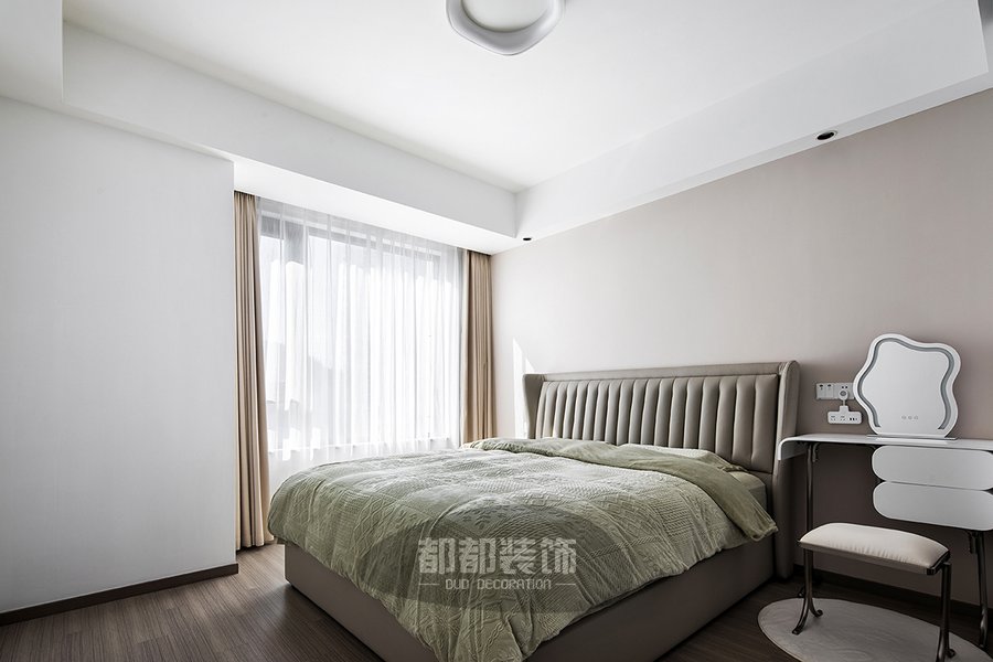 棉麻的床品配上平滑的皮质床头板,温柔的浅绿色流露出一丝时尚与浪漫,在舒适与艺术间产生共振,白色窗帘清清爽爽,营造出易于安眠的空间氛围,简易的梳妆台搭配异型化妆镜