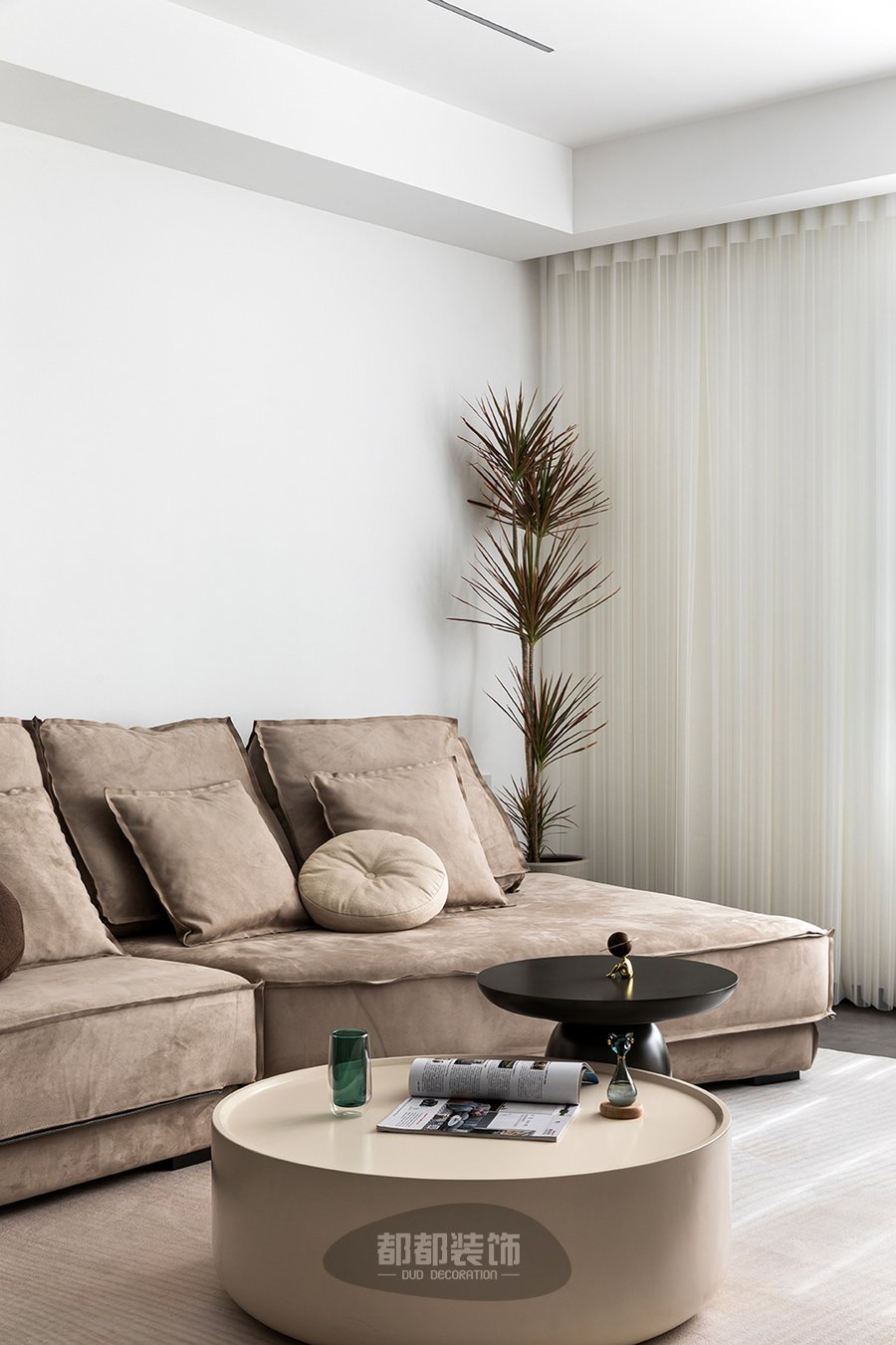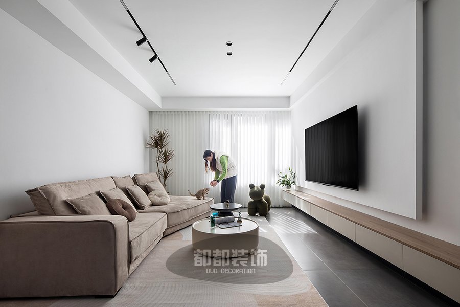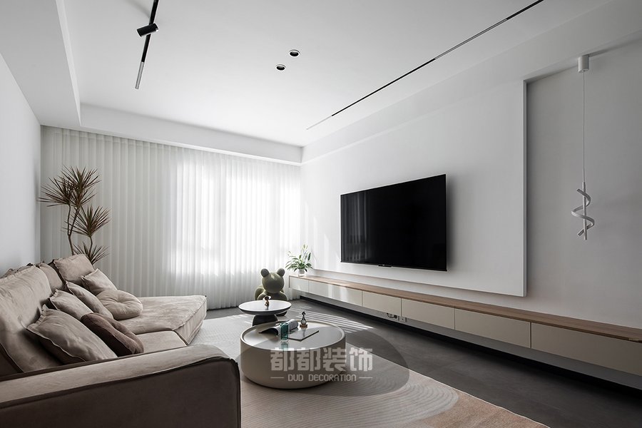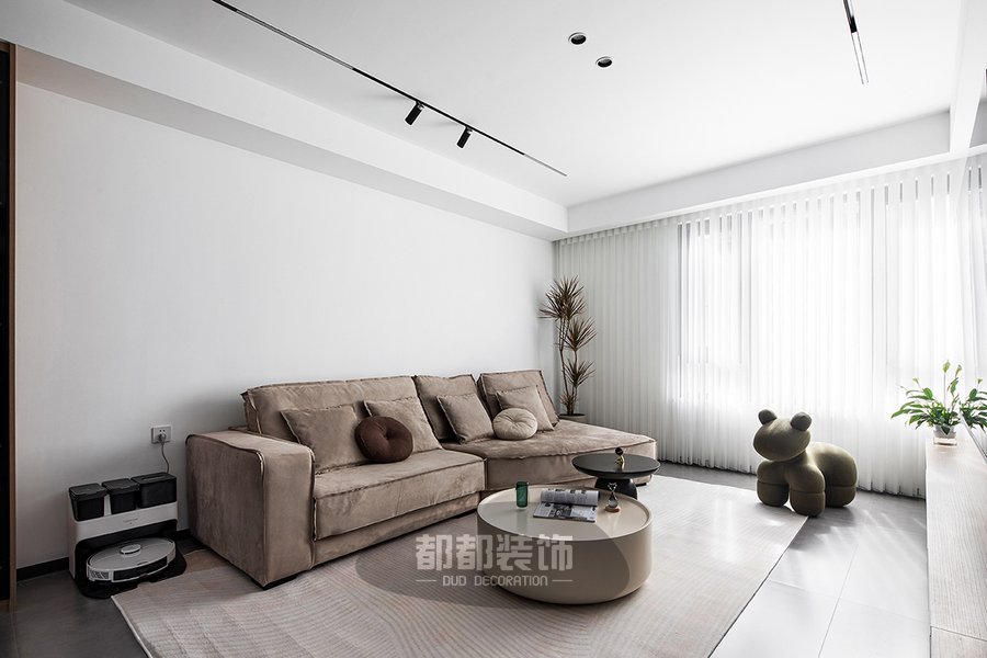 客厅以白色和奶茶色软装家居作为搭配,让空间灵动又富有高级感,太阳光穿透百褶窗帘且洒落一室,给人以明净、宽敞的视觉感受,大面积的留白、纯净的色调给家带来更舒适的自然状态,让家的轮廓更为迷人。