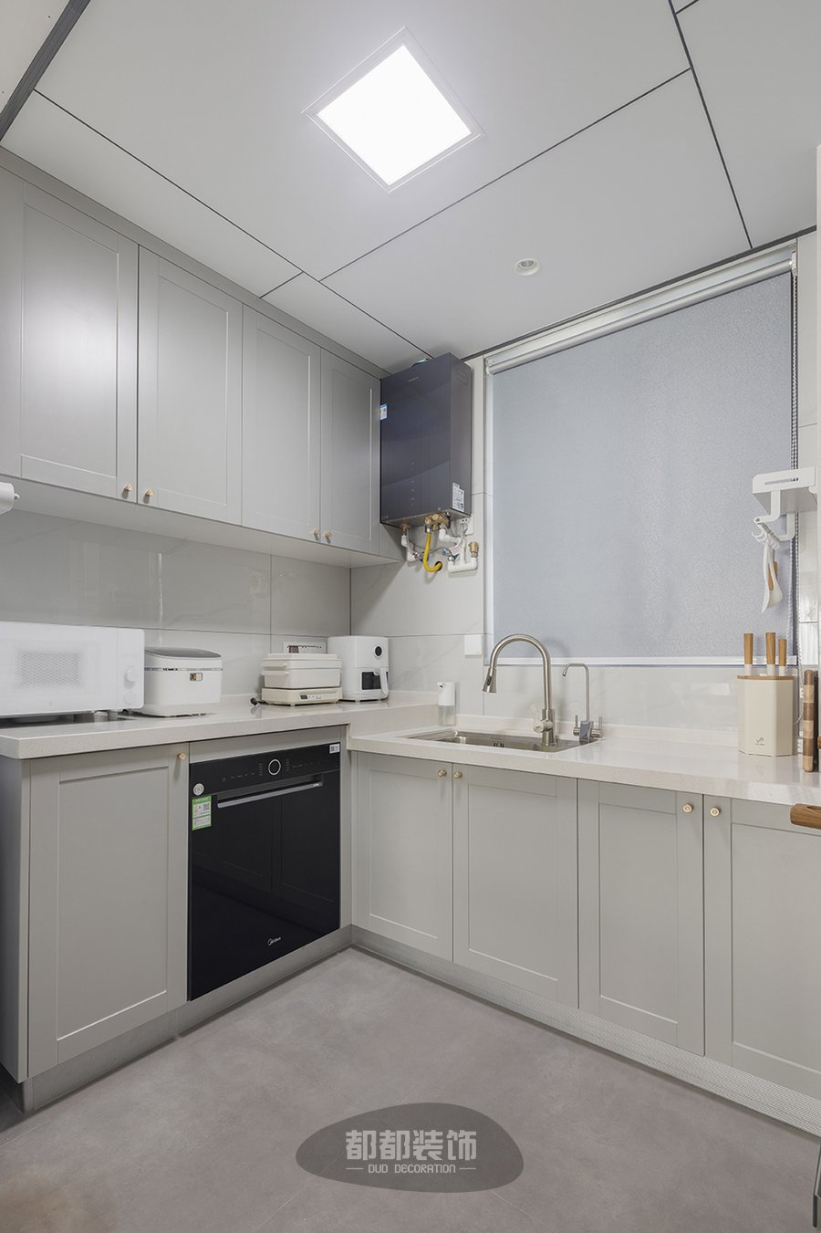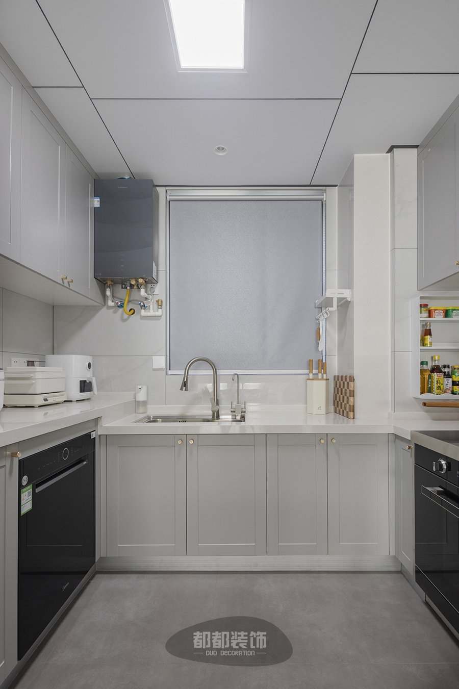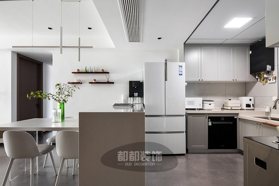 开放式U型厨房,冰箱、洗菜池、炒菜区依次排布,功能分区合理;顶端方形灯为夜晚进行照明,增加空间氛围感,橱柜金色小把手设计简洁大方,地柜+吊柜强强联手收纳满分!
