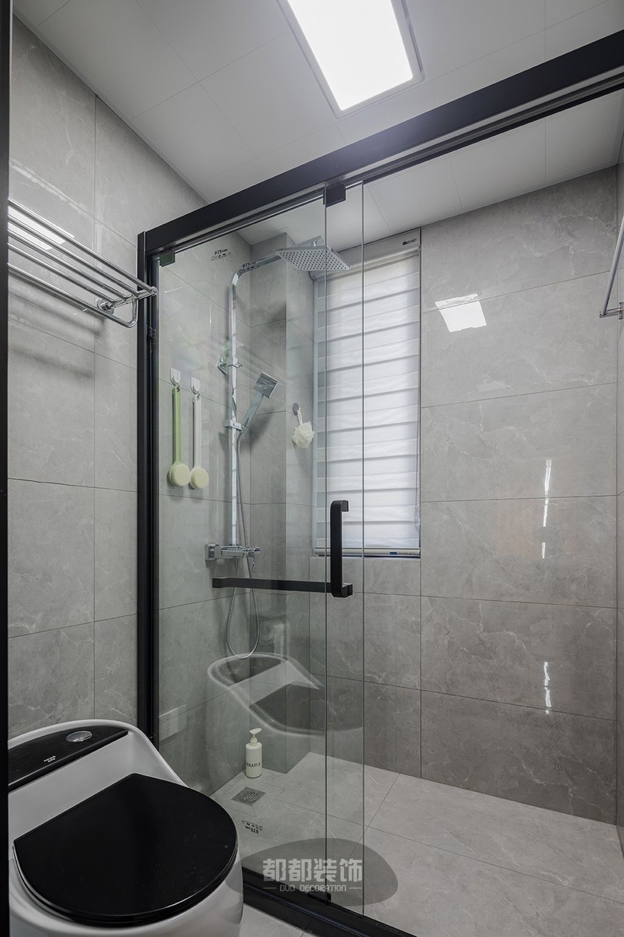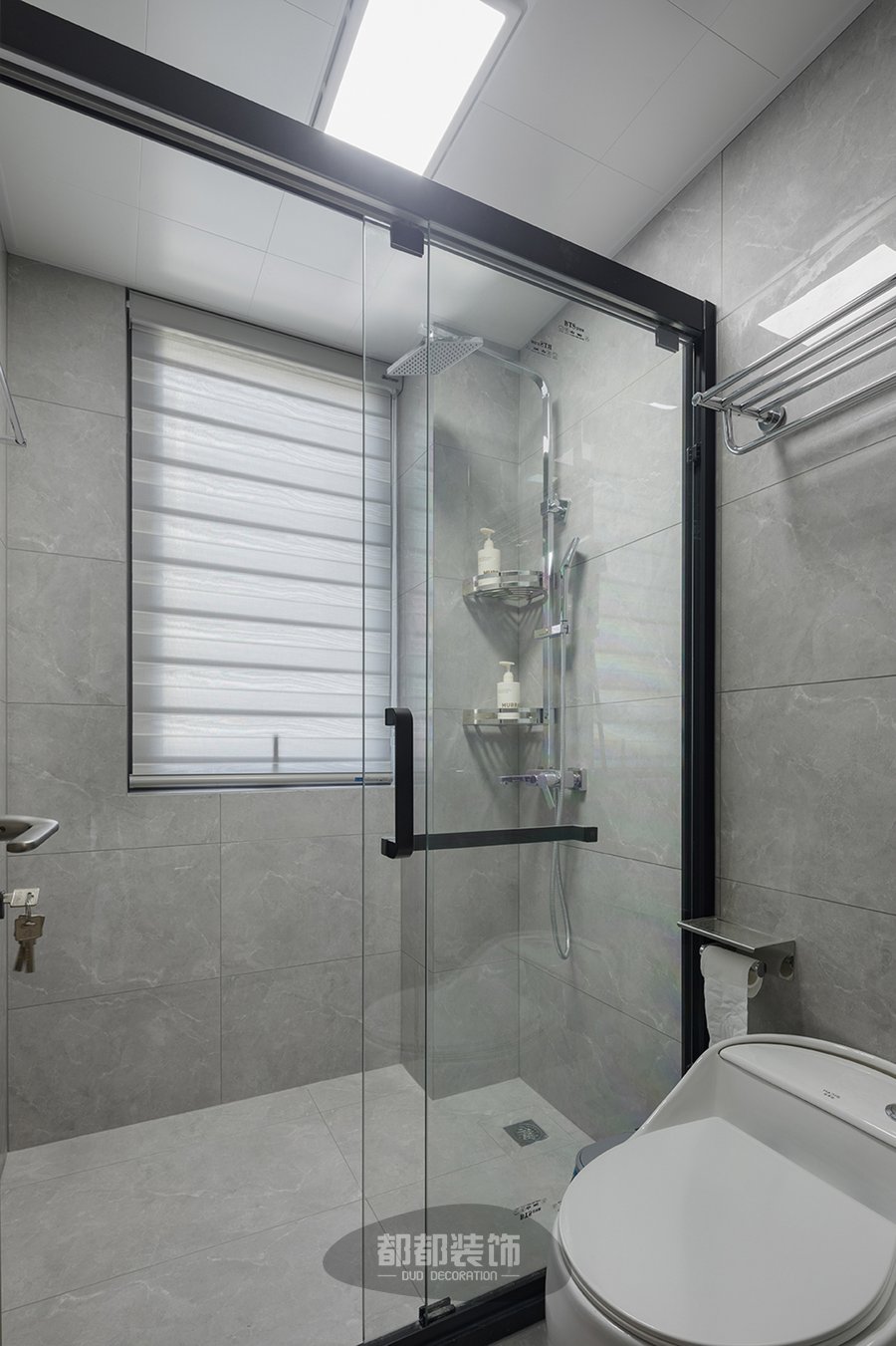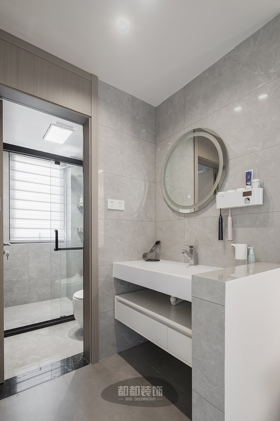 卫生间干湿分离,规整有序,使用也非常方便,设计主要强调简洁、明晰的线条和优雅、得体有度的装饰,注重实用性、品质感和细节,灰色作基调,加以岩板台面叠加,使得纵深感进一步加强,合理的分区设计,洗漱、淋浴、如厕,各个功能区独立存在,动线流畅舒适。