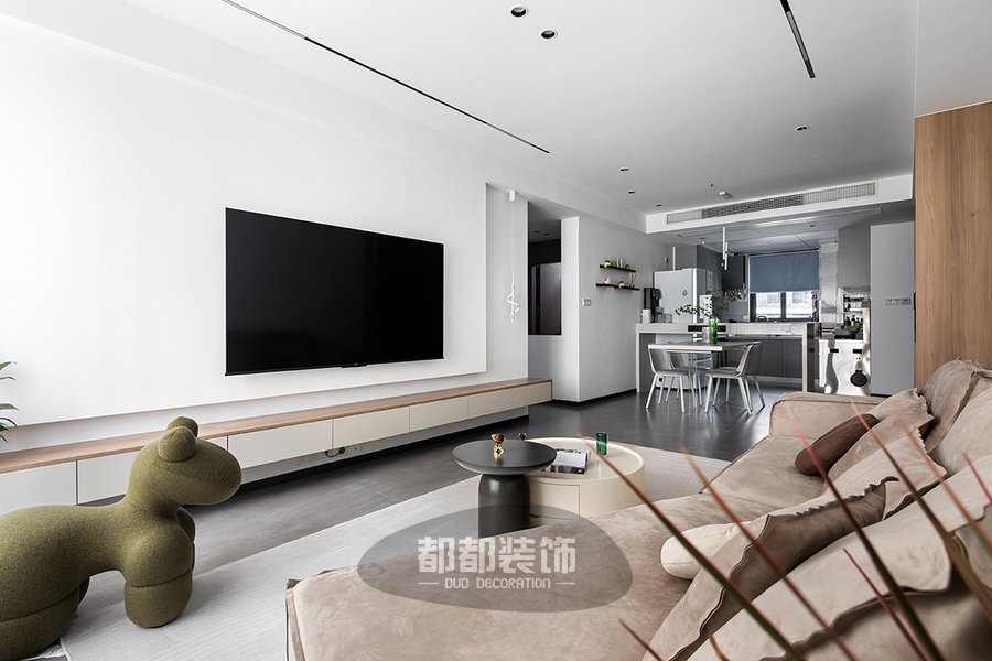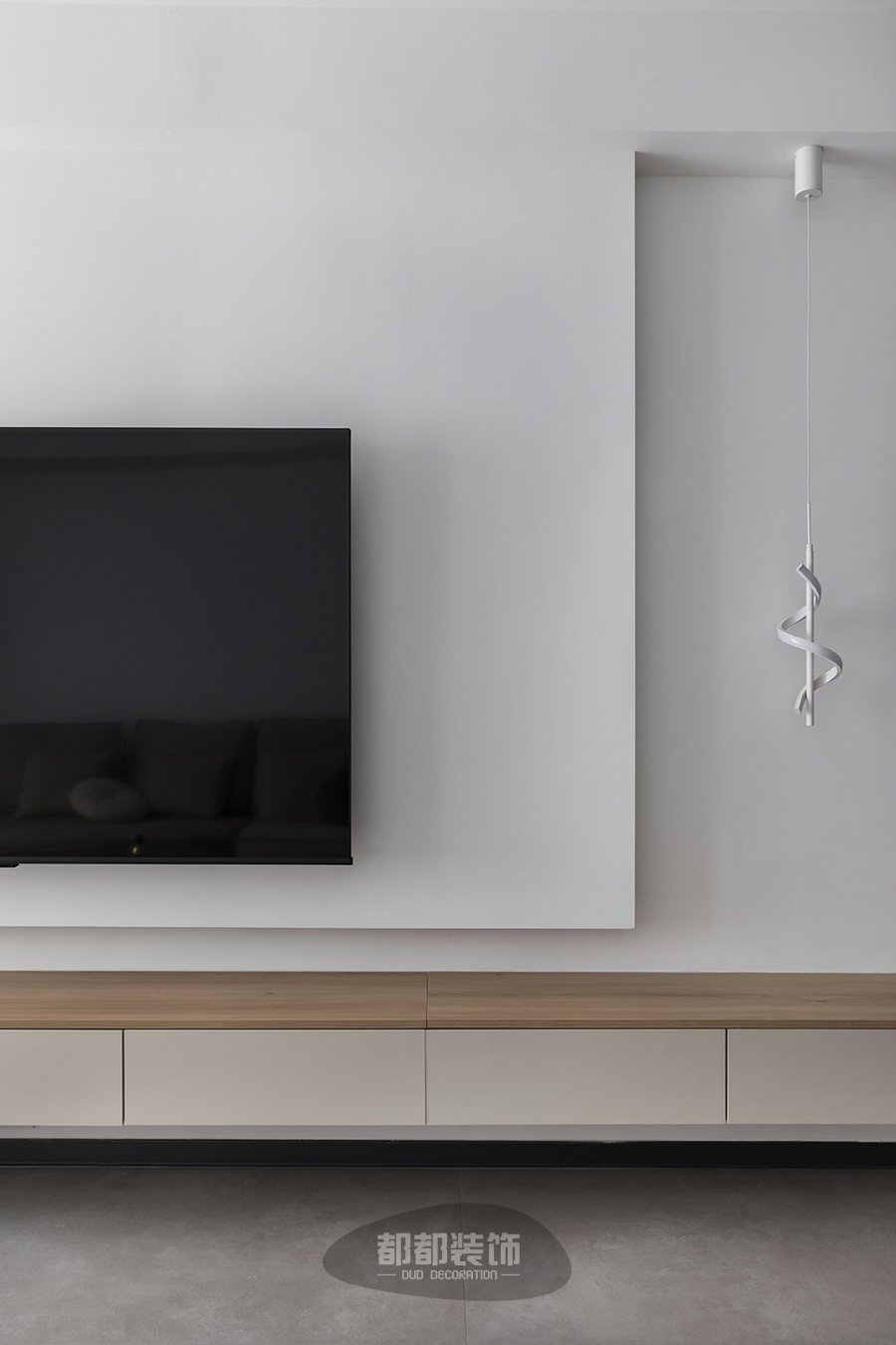 纯粹素白的电视背景墙以悬浮的形式增加空间的层次感,左侧电视柜上的吊篮绿植作为绿色元素可以增加安逸的自然感,原木+绿色刚好是森林的色调。