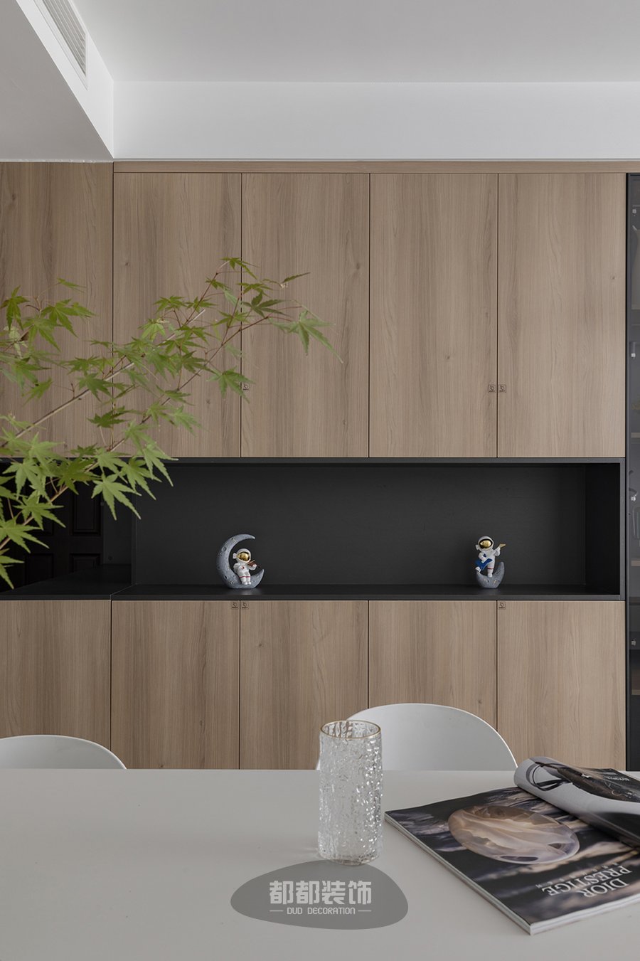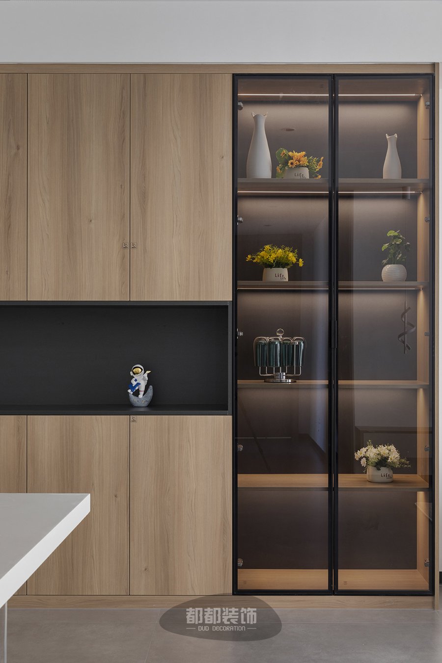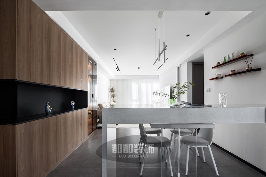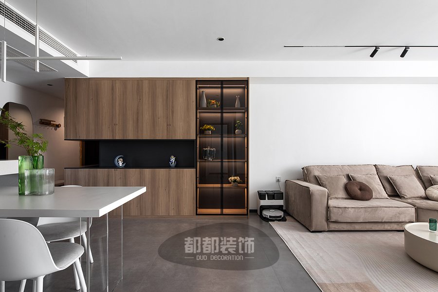 胡桃木色的餐边柜采用玻璃门柜+中间镂空+无把手的设计,开放式与封闭式收纳相结合,满足不同的收纳需求,使胡先生的两口生活变得更加悠然自在。
